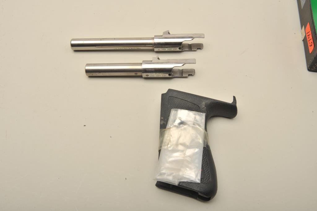 barrel, mat black finish, checkered polymer grips, S/N 129 533, in overall fine condition and with factory two piece cardboard box, one extra magazine and instructions. Also with this lot is an extra set of checkered polymer black grips plus a 4” .45 ACP barrel with very good to fine bore and a 5.5” 9mm Para. barrel with very good to fine bore. (Modern/PPT). Est.: $1,200-$2,400.