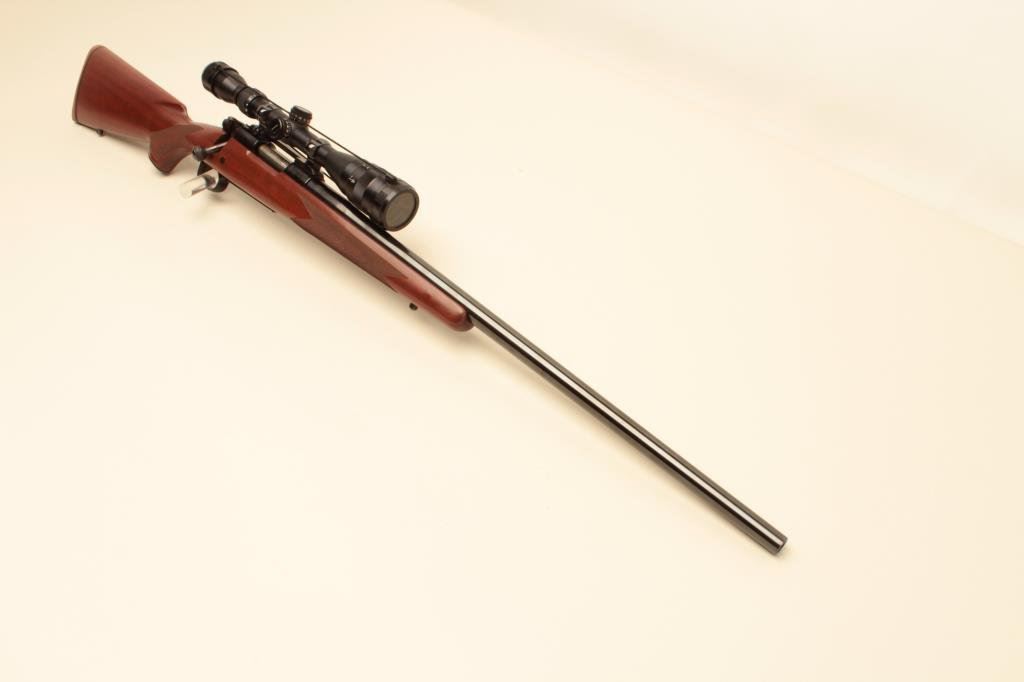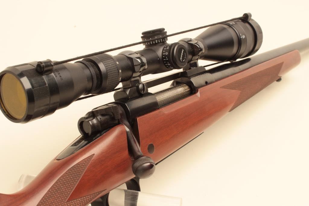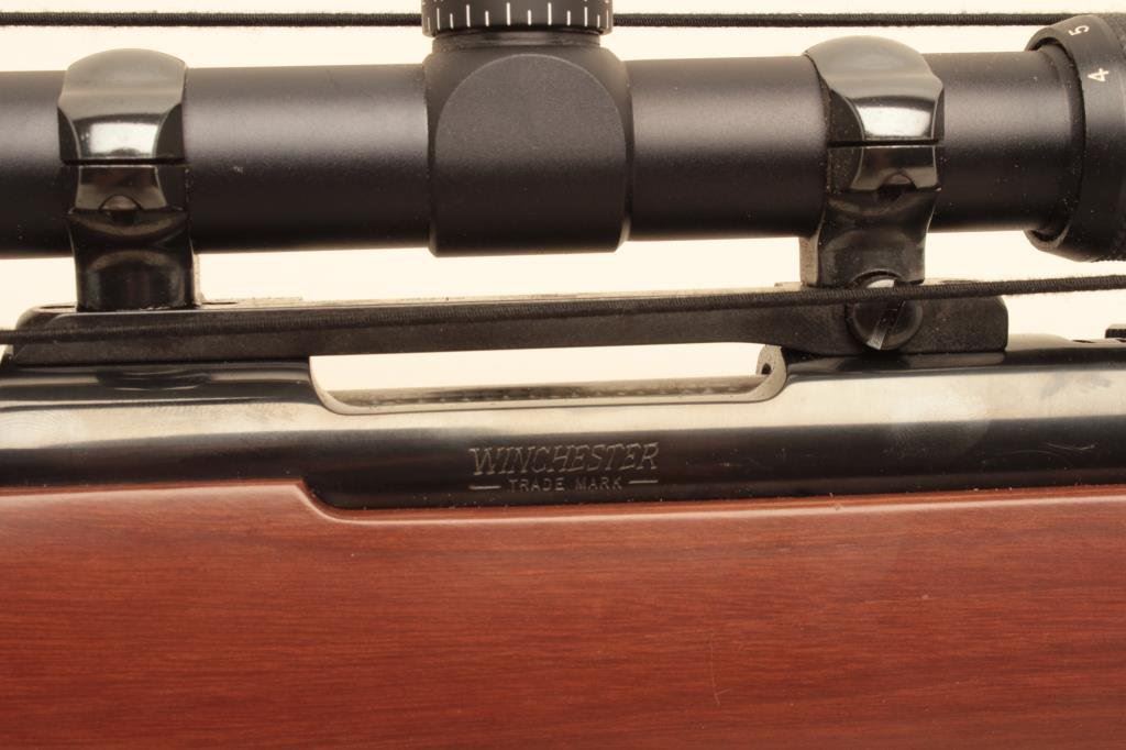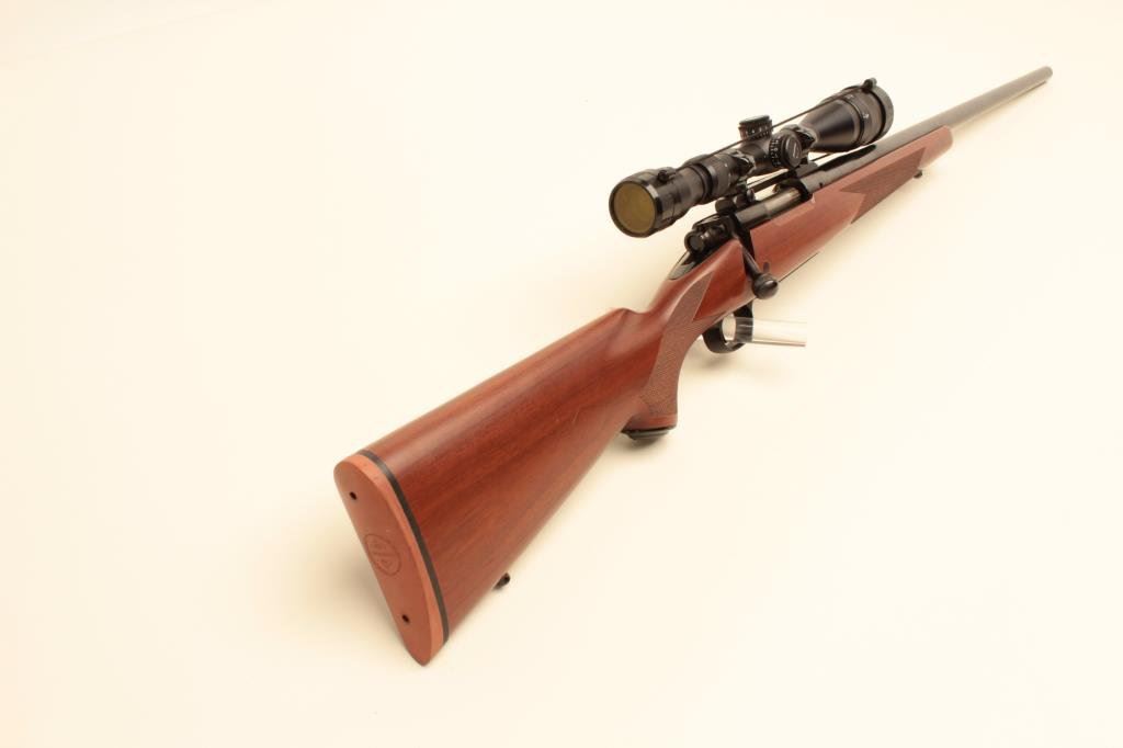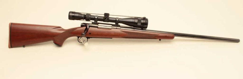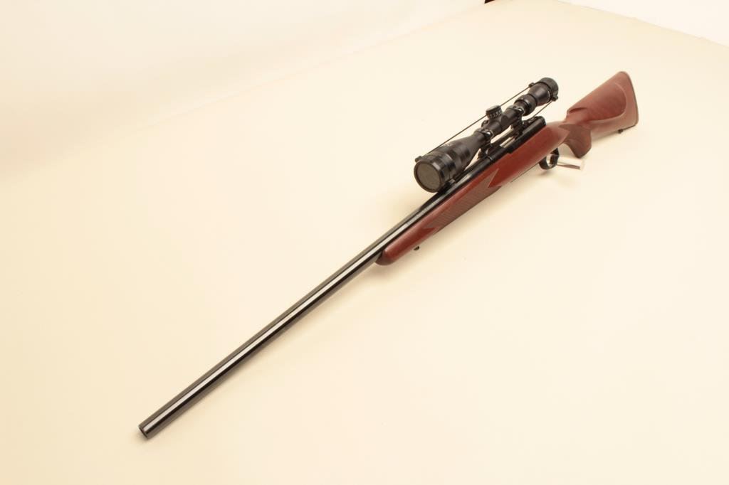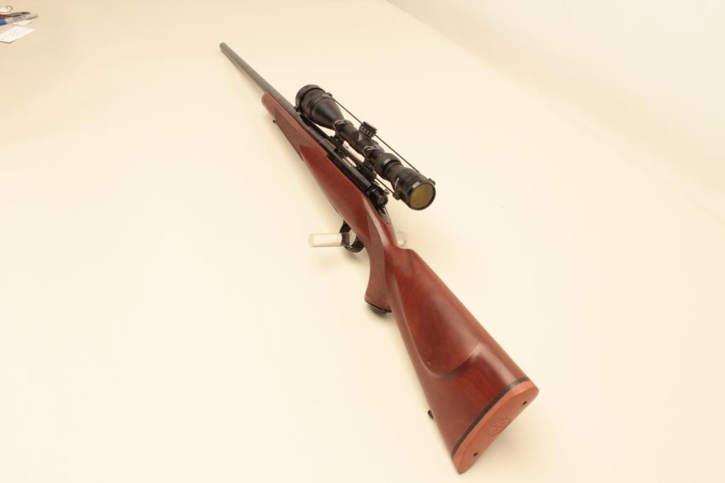 Serial #G1996186. The rifle is in very good overall condition with a 26” heavy barrel. The barrel and receiver retain the majority of their blued finish with light wear from carry and use. The checkered wood stock is in very good condition with small mars and compressions consistent with field use. The butt stock ends with a red rubber Winchester marked butt pad. The rifle is topped one-piece Redfield scope mount and a Tasco 4 x 12 x 40 variable power scope. The bore is very good, the action crisp and markings are sharp. Est.: $400-$800. (Modern).