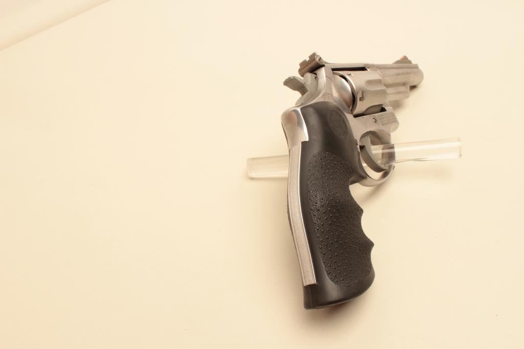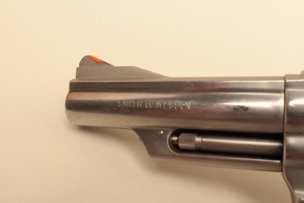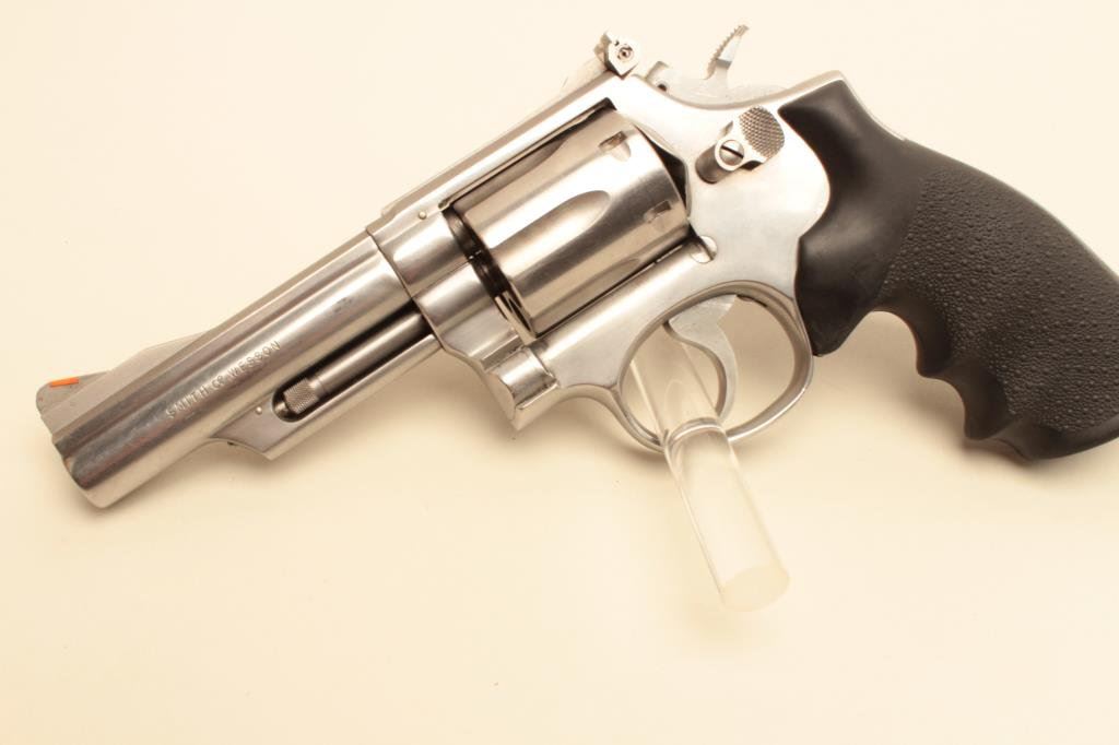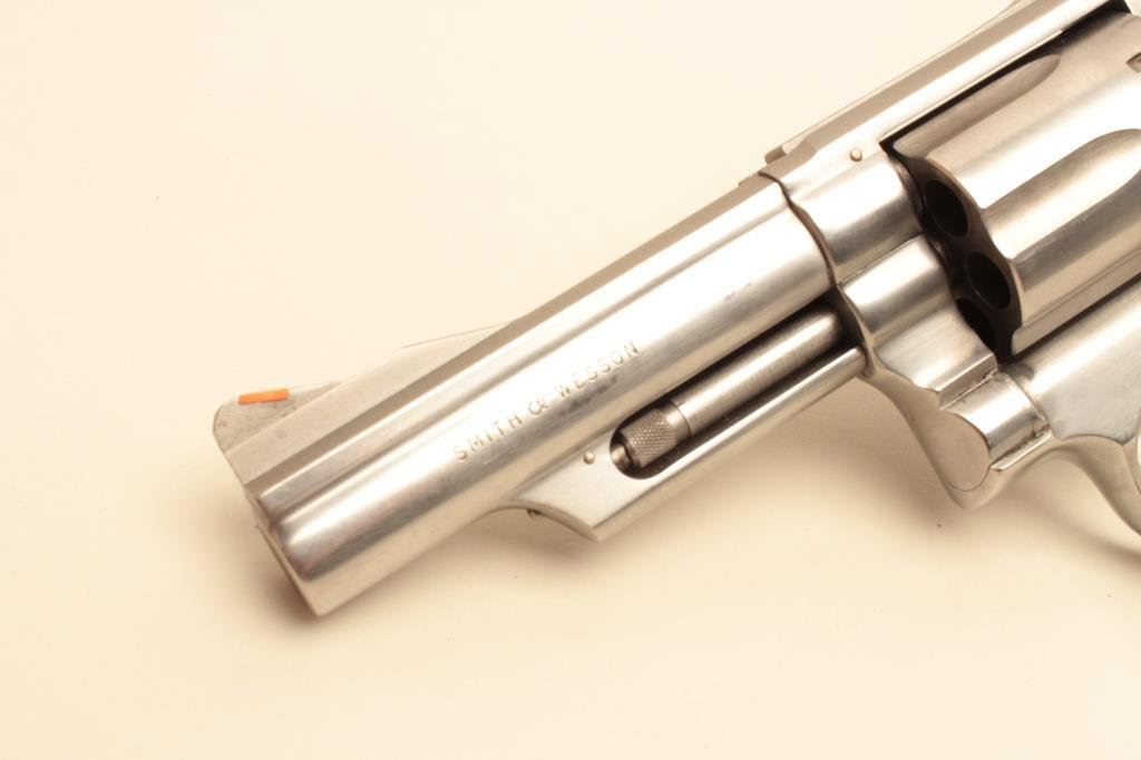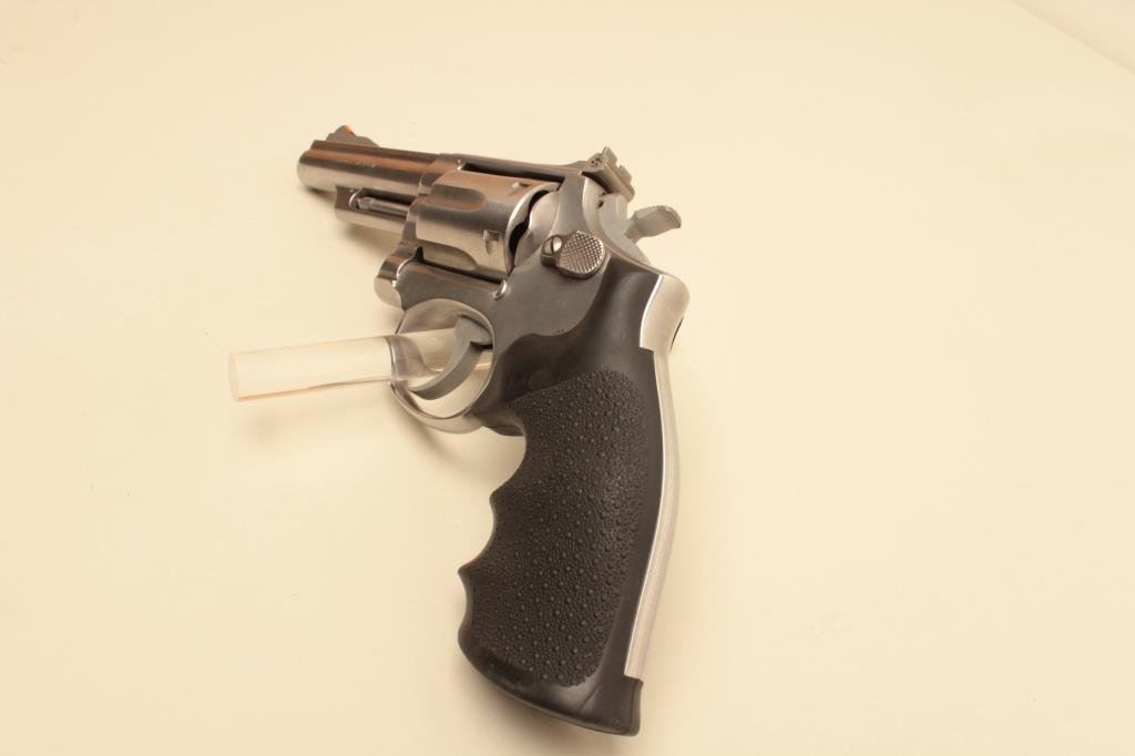 Magnum caliber, 4” barrel, stainless, Hogue stippled finger groove hard rubber grips, S/N 4K61768, in overall very good to fine condition with a crisp action and markings, very good to fine bore, very good grips. (Modern/PPT). Est.: $300-$600.