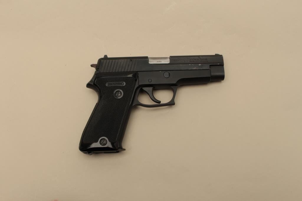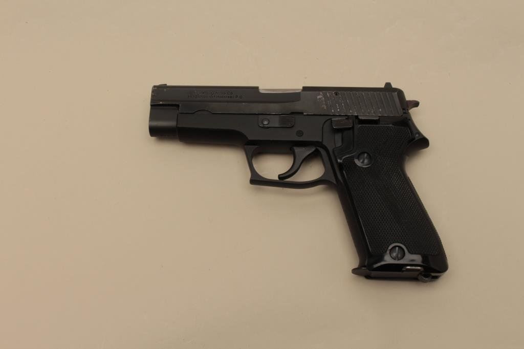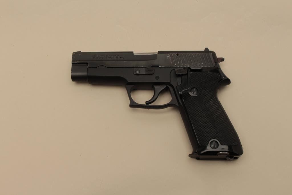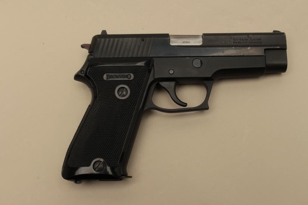 The pistol is in good overall condition with a 4 ¼” barrel. The slide shows light surface erosion, pin prick pitting and loss of finish at the front end and at the rear of the slide. The pistol is marked, “SIG-Sauer System Made in West Germany” on the right side of the slide. The checkered plastic Browning grips are in good condition showing wear from carry and use. The bore is good, the action crisp and markings are legible. The lot includes one correct magazine. Est.: $400-$800. (Modern).