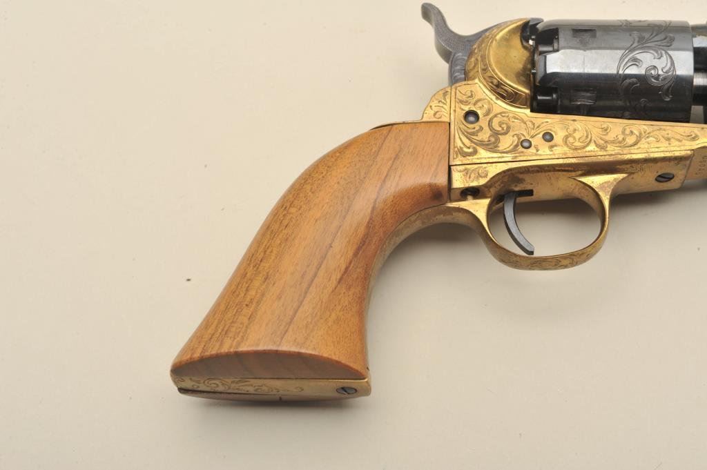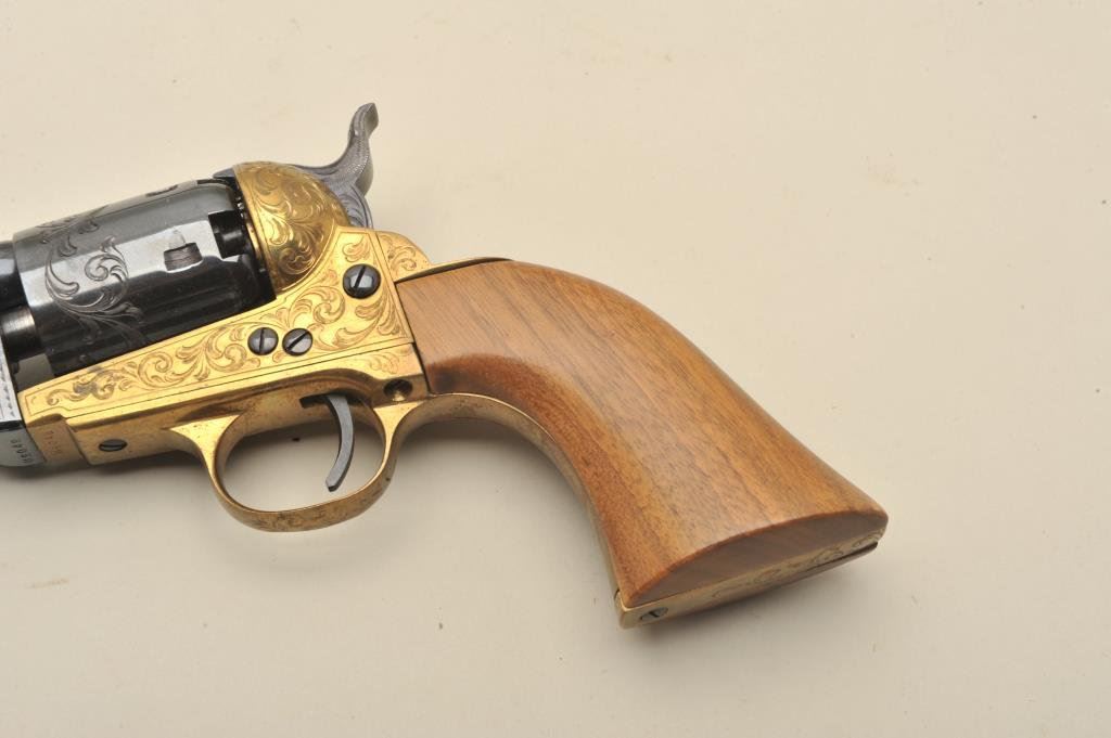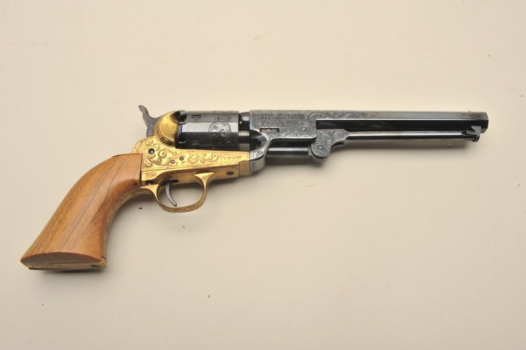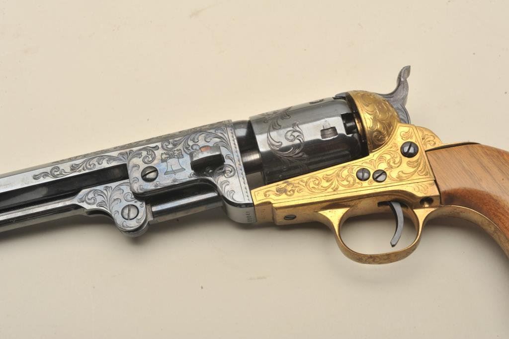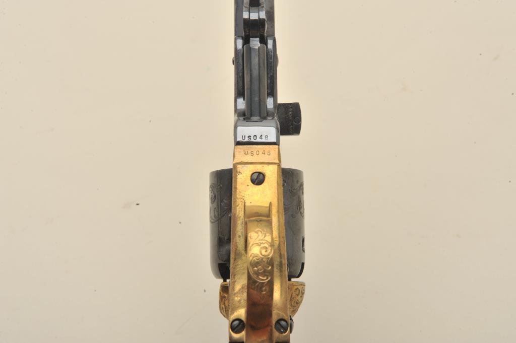 caliber percussion. Presentation hand engraved (1 of 100 produced), S/N USO48. Like new in original box with no sign of firing or use. The engraving is a classic “open scroll” reminiscent of Mid-19th century and expertly finished very attractive with liberty bell vignette on the left side of the barrel. (Percussion) Est.: $600-$1200