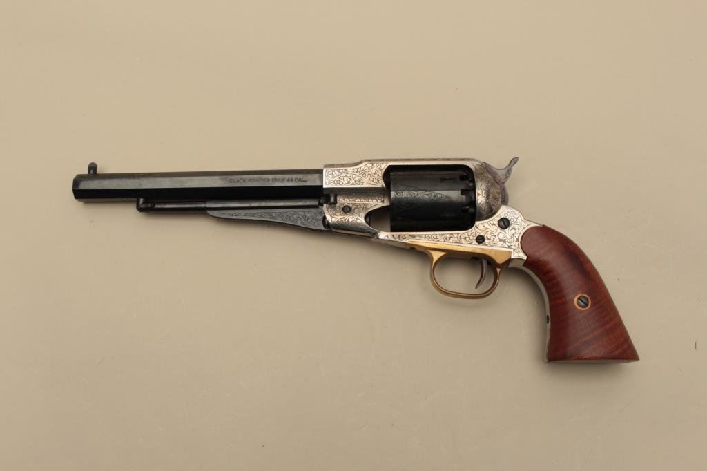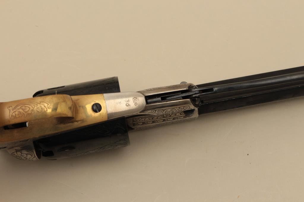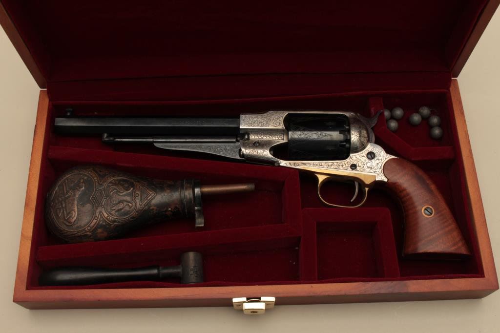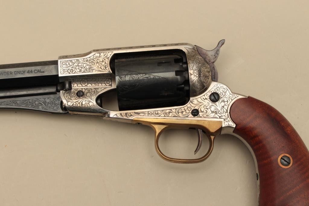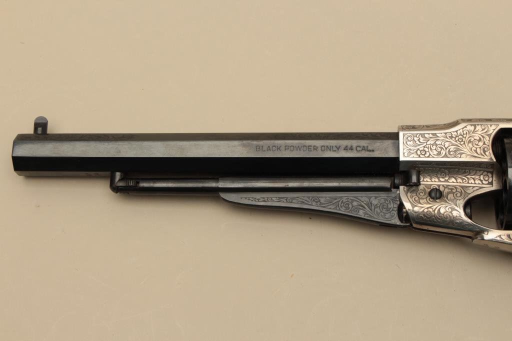 action revolver, .44 caliber, engraved, blued finish to barrel assembly and cylinder with frame in the white; wood grips, S/N 208696, in like new condition with finely accomplished engraving; in wood presentation case with antique brass powder flask and powder measurer. (Percussion). Est.: $750-$1,250.