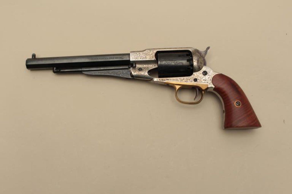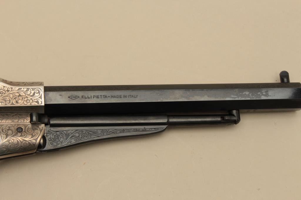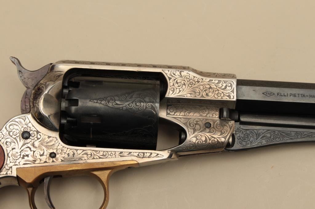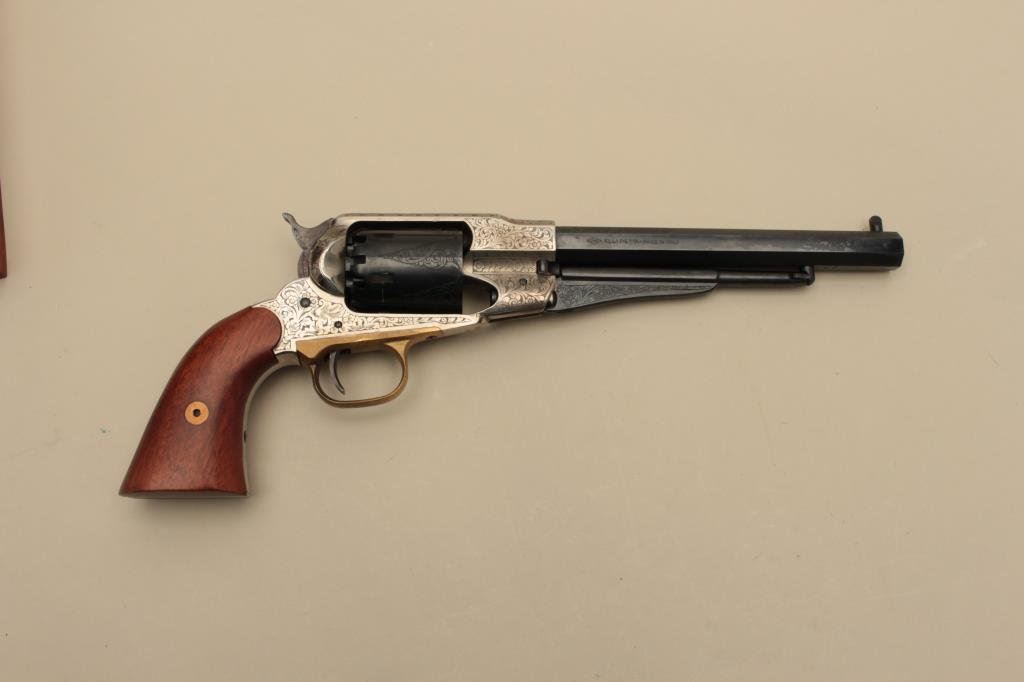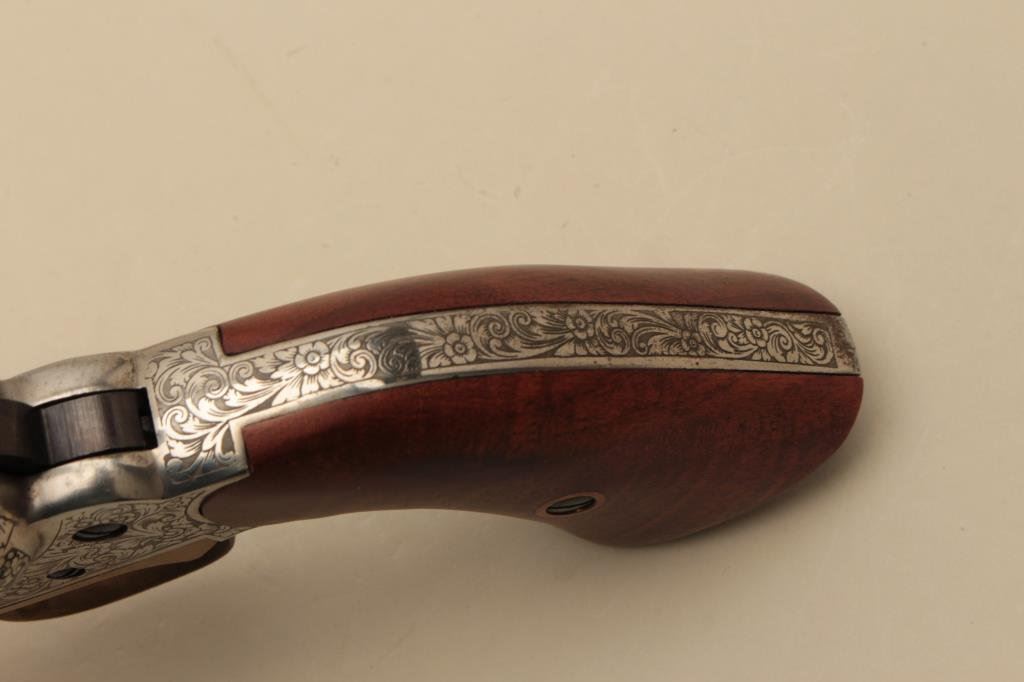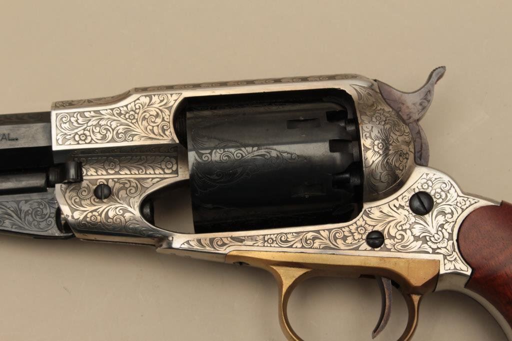action revolver, .44 caliber, engraved, blued finish to barrel assembly and cylinder with frame in the white; wood grips, S/N 208696, in like new condition with finely accomplished engraving; in wood presentation case with antique brass powder flask and powder measurer. (Percussion). Est.: $750-$1,250.