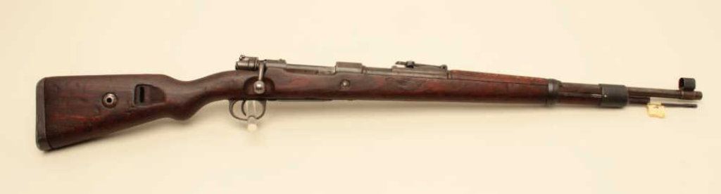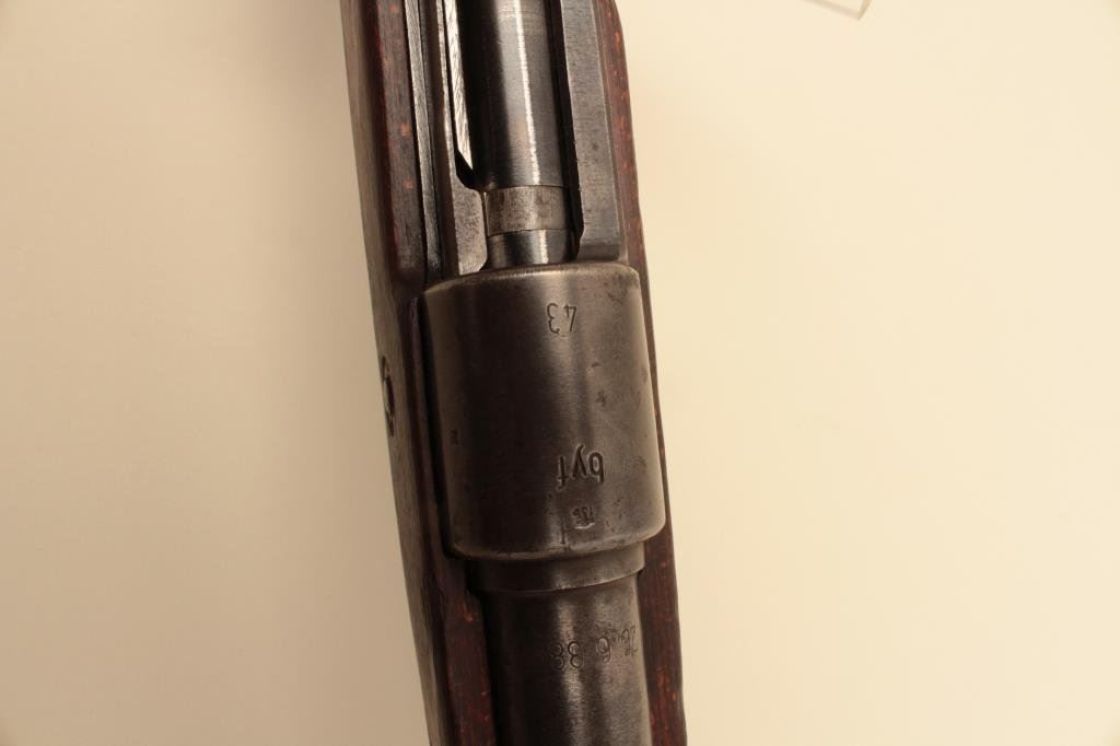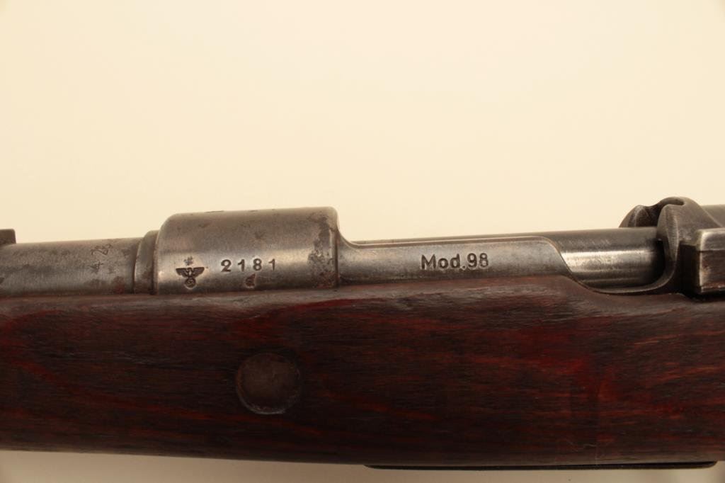 caliber, Serial #2181. The rifle is in good overall condition with a 24” barrel with a hooded post front and military tangent style rear sights. The barrel retains the majority of its military finish with Nazi proofs and some light surface rust and erosion. The receiver is also Nazi proofed in several locations. The front ring is marked “byf”, dated 1943 with all matching visible serial numbers and “byf” on the magazine base plate. The rifle retains the bayonet lug and cleaning rod. The smooth wood stock is in good condition showing heavy use with bruising, compressions and residual grease from storage. The butt ends with a smooth steel butt plate. The bore is good, the action crisp and markings are sharp on this WWII era Mauser. Est.: $600-$1,200. (C+R).