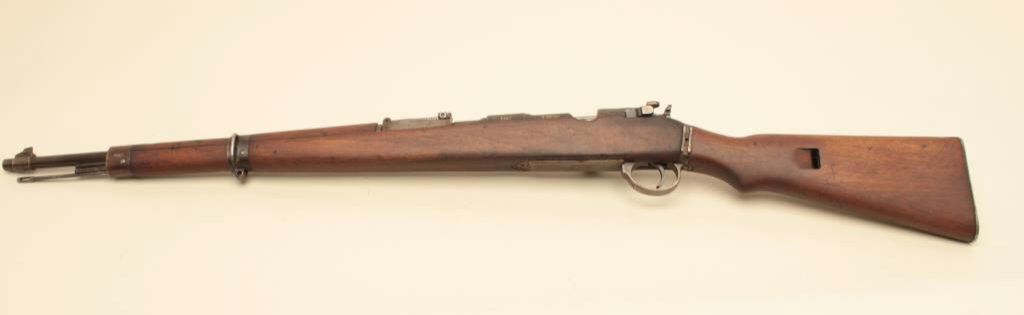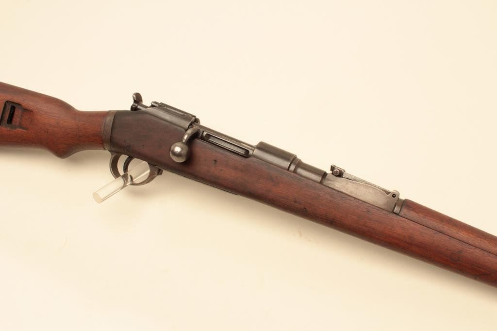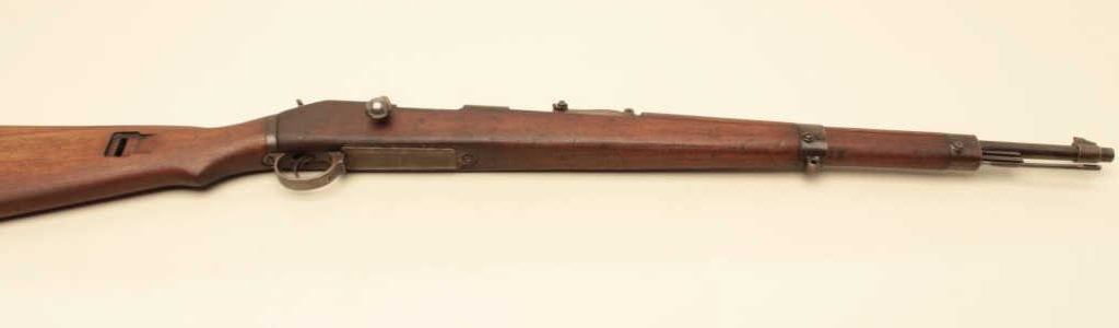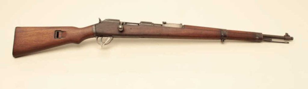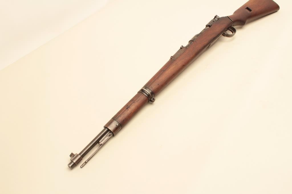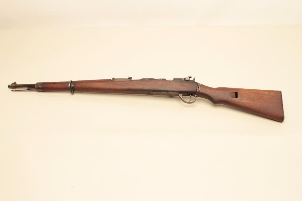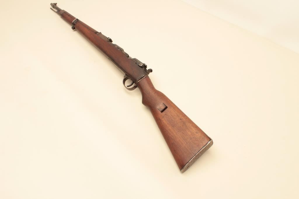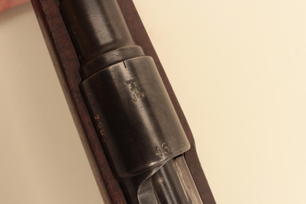 #7907. The rifle is in good overall condition with a 24” barrel with a ramp front and military tangent style rear sight. The barrel and receiver retain the majority of their original thinning military finish. Both the barrel and the Mannlicher action are Nazi proofed. Manufactured by Femaru of Budapest between 1941-1944, the front ring of the receiver is marked, “jhv” which is the German ordnance code for Femaru and dated 1943 All visible serial numbers are matching, except the magazine base which is close. The smooth wood stock is in good overall condition with mars, dents and compressions consistent with service use. The bore is fair, the action is crisp and markings are sharp on this rare, desirable WWII Mannlicher manufactured in Hungary and Nazi marked. Est.: $500-$1,000. (C+R).