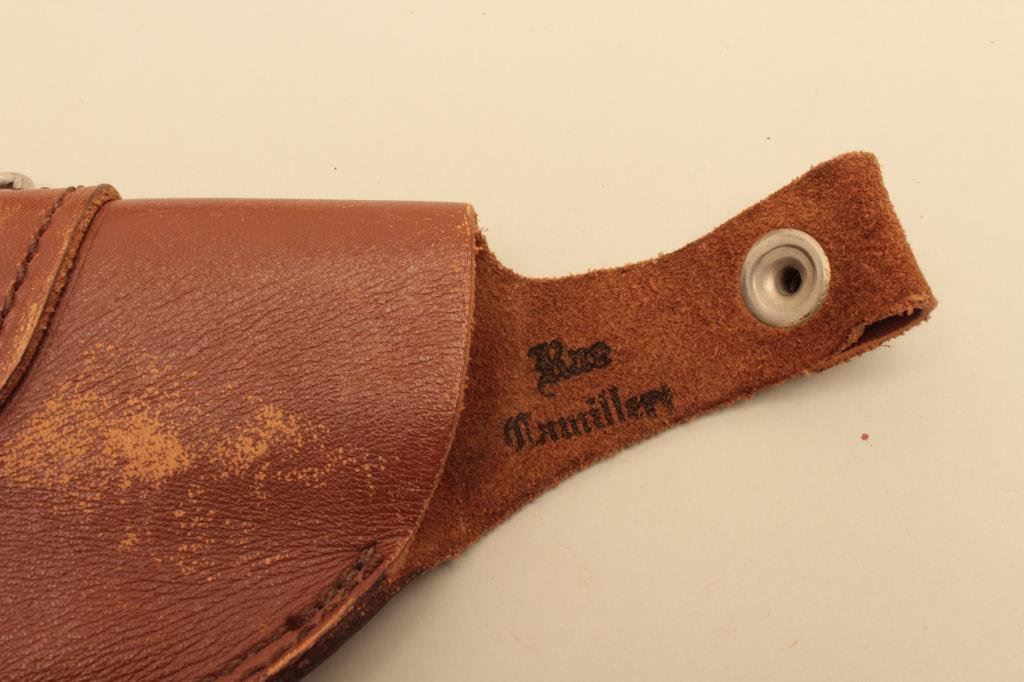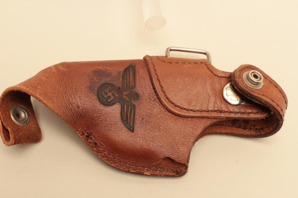 pistol was used during the 1936 Berlin Olympics. The pistol is in good overall condition with a swastika and iron cross on the frame. The left grip panel also has a swastika and the base of the grip has a brass plate with the five Olympic rings, 1936 and Berlin etched into it. The lot also includes a leather holster with the German eagle insignia dated 1936