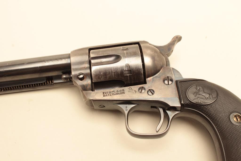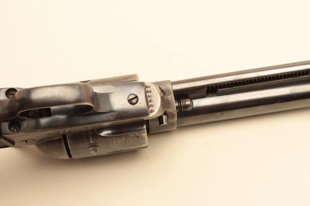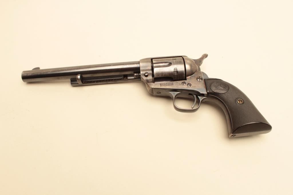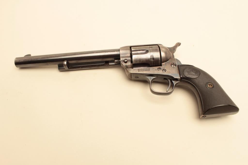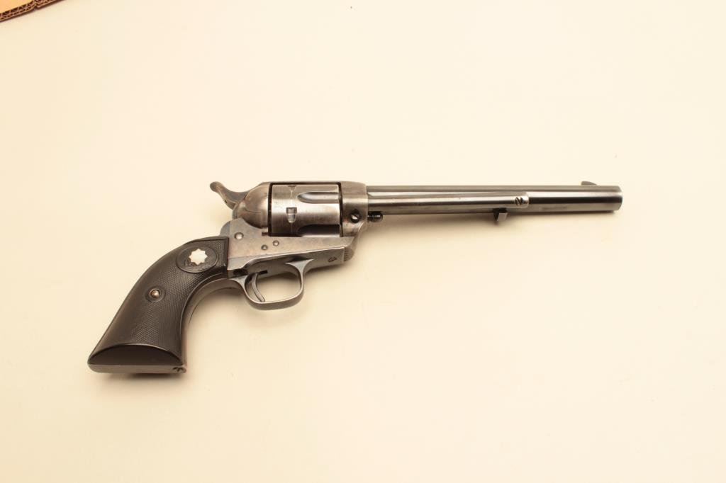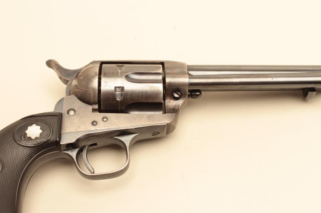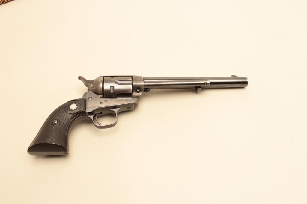 with a 7 ½” barrel, blue and case colored finish, hard rubber grips, S/N 339464. 75%-5% original bright blue drifting on the high points and cylinder. 60%-80% case hardening with good rainbow hues just aging slightly and toning nicely. The front sight has been reduced slightly. The straps show 0.5 toning blue to the patina. 0.75 plus case hardening on the hammer with bright blue on the small parts and trigger. The grips are very good plus and fit impeccably. A carved mother of pearl inlay into the right grip where rampant Colt is located showing 8 pointed star. Locks up tight with bright bore. An exceptional Colt made about 1920 from Salt Lake collection. (C&R/No PPT) Est.: $1750-$3500