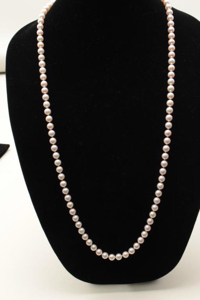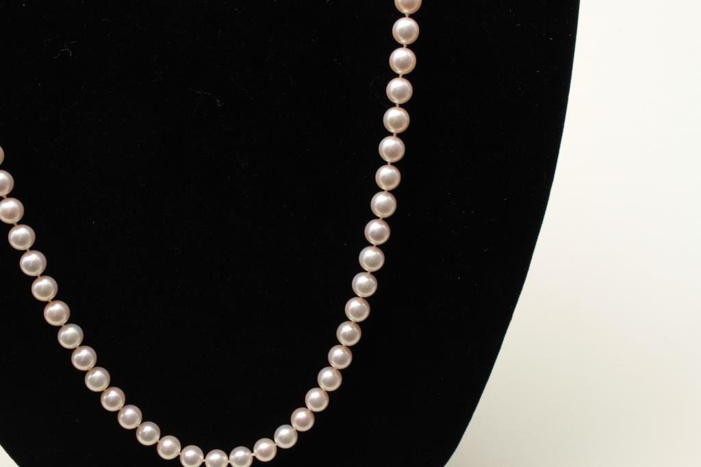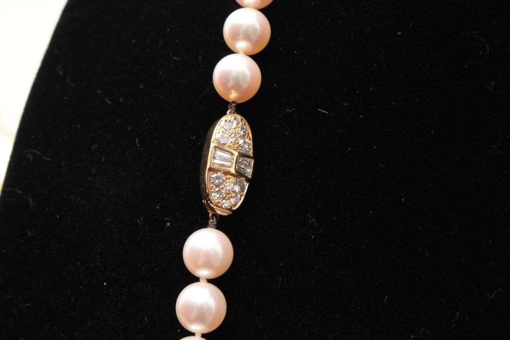 cultured pearls of approximately 8-8 ½ MM with a 14K diamond mounted clasp. Measures 36” in length with 101 pearls. Gemologist appraised at $20,000 in 1984. Purchased in Beverly Hills. Estate consigned. The best compliment we can give this set is they are the grade normally collected by the Japanese buyers who appreciate their rarity in this grade. Est.: $2800-56000