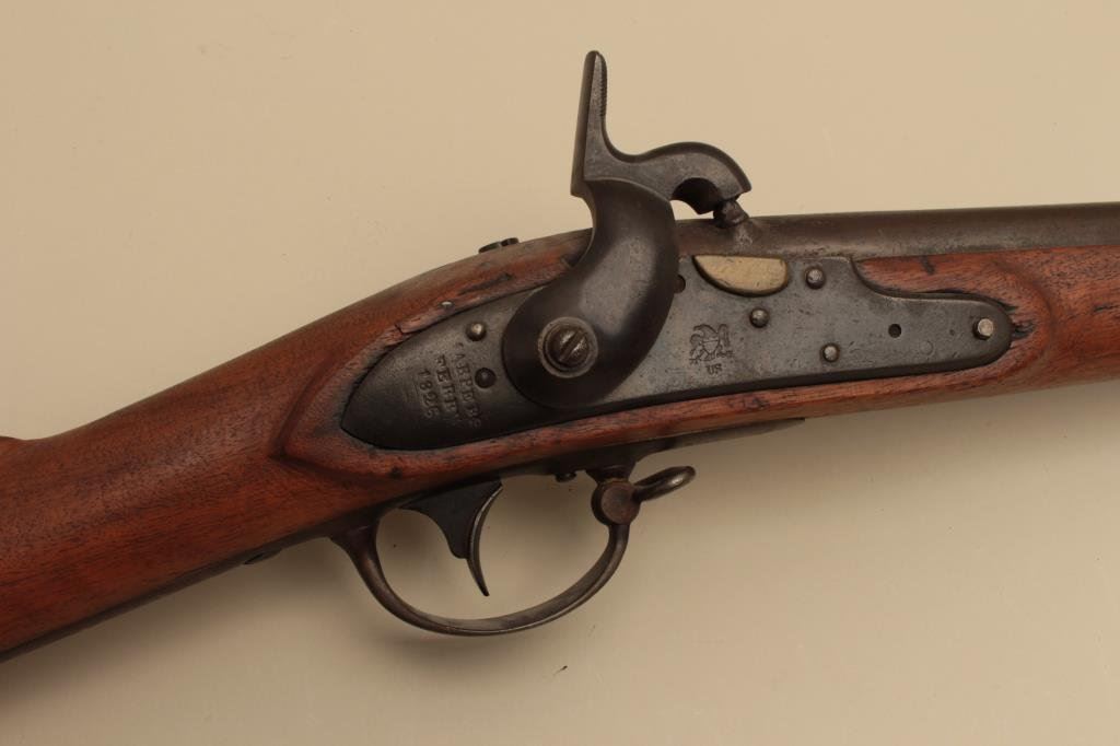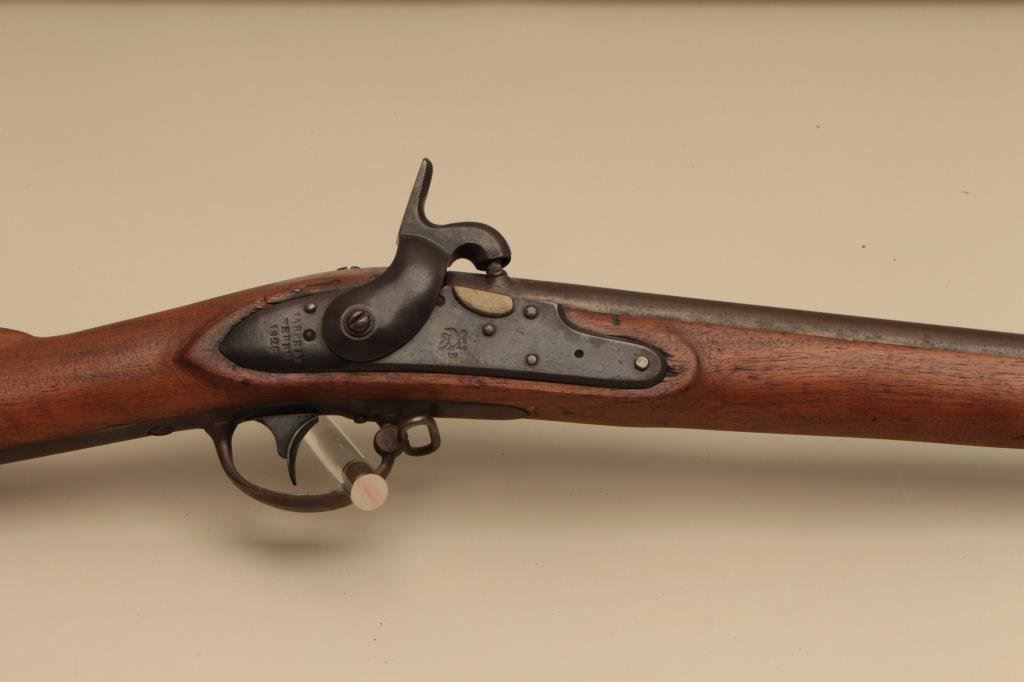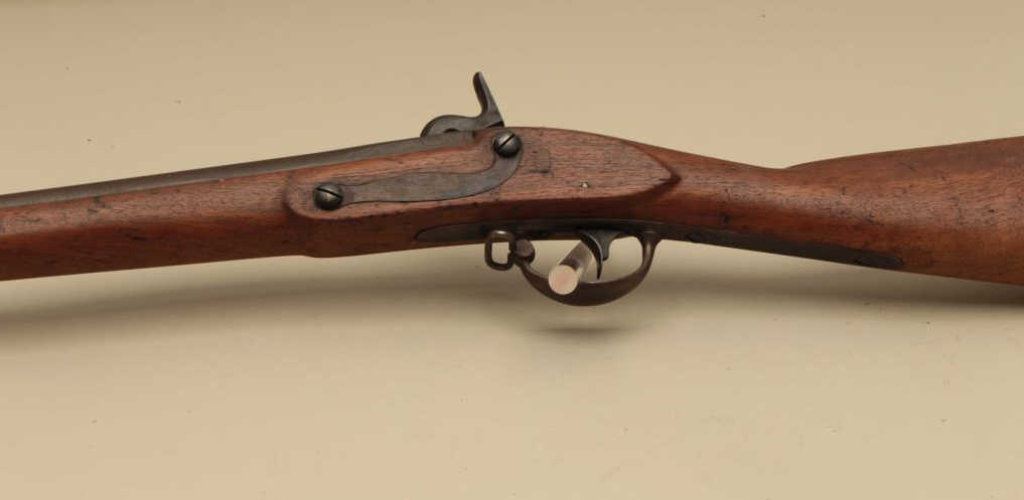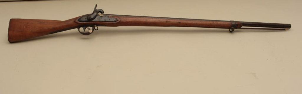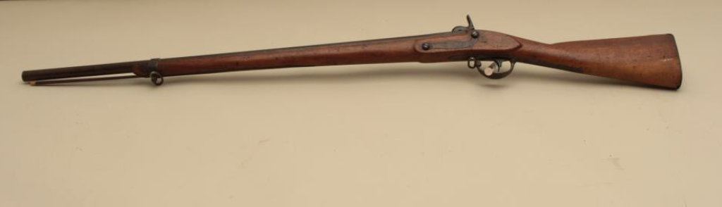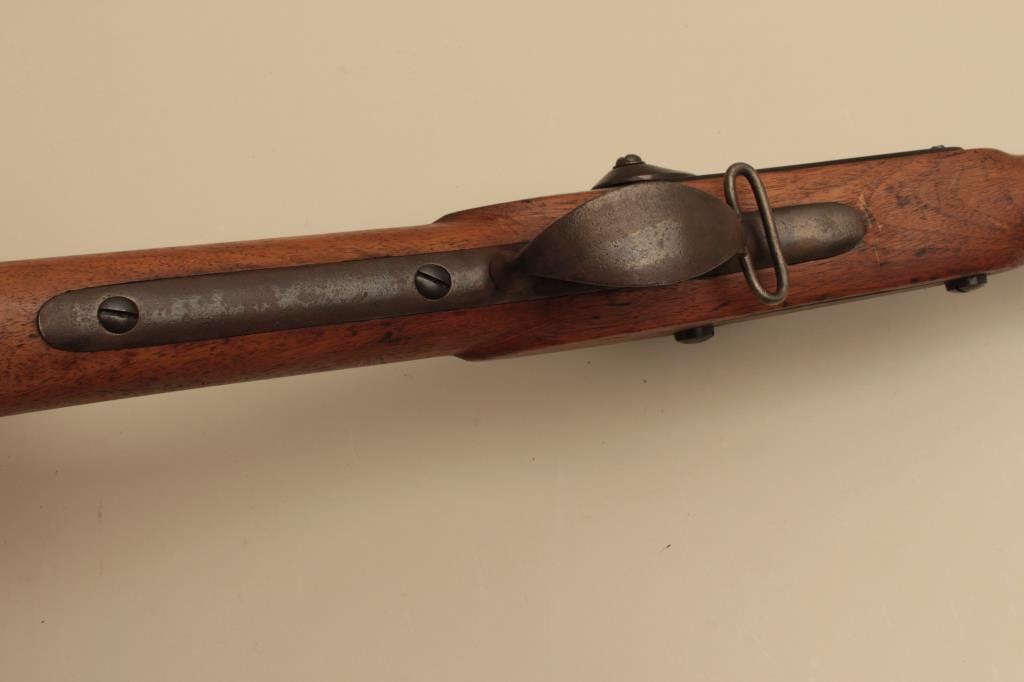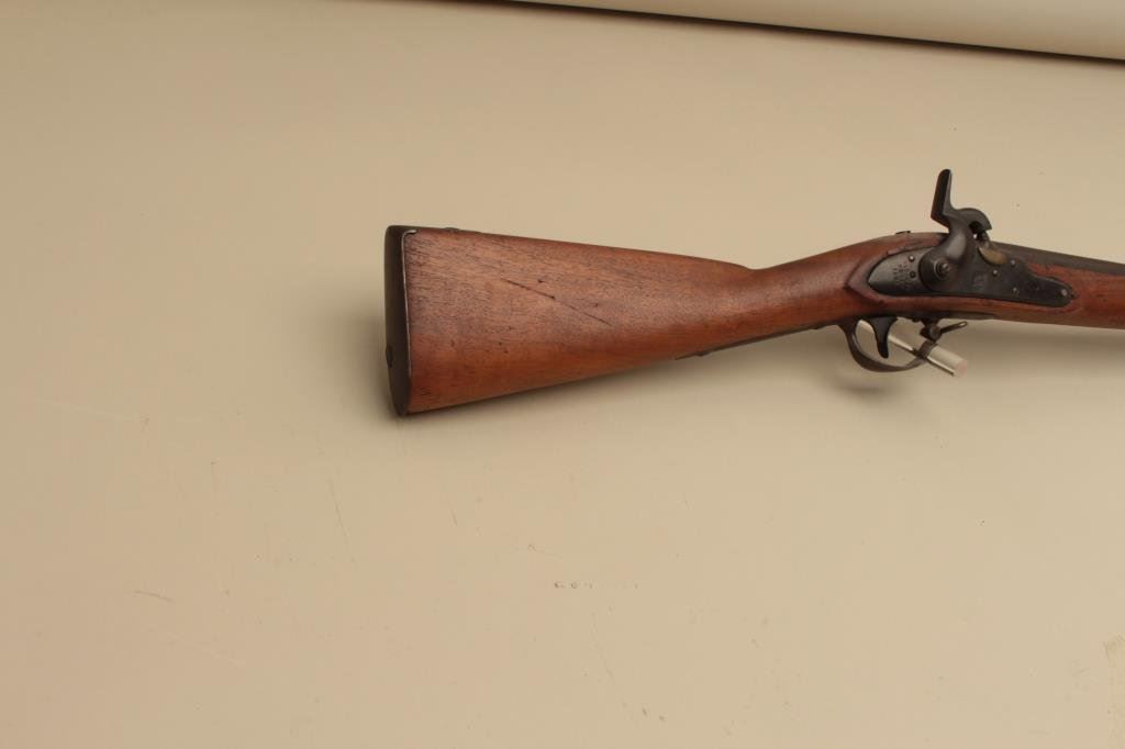 Serial #NSNV. The rifle is in fair overall condition with a 34” barrel. The metal surfaces have gone to dark patina with light surface rust noted. The receiver is US marked with the eagle emblem and has been converted to percussion during the period of use. The smooth wood stock is in fair condition with a cartouche on the left side of the tang. The butt ends with a smooth steel butt plate. (Antique). Est.: $400-$800.