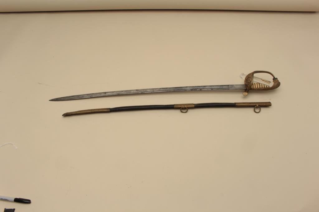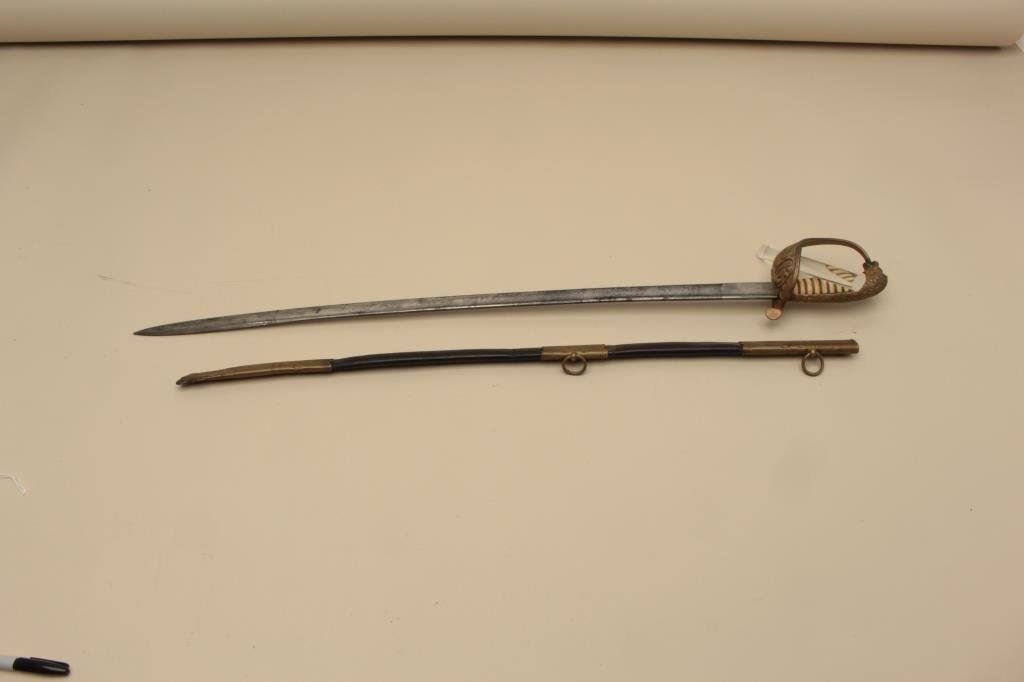 lion’s head pommel, wire wrapped grip; blade is decorated with naval scenes; overall good un-cleaned condition. Est.: $300-$600.