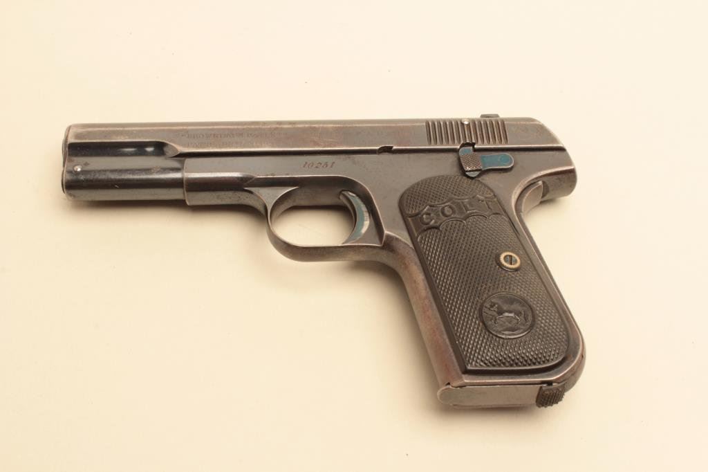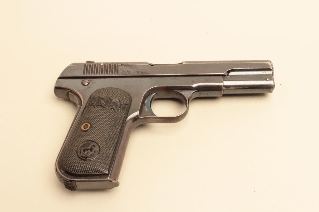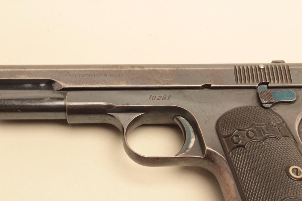 and high polish blue finish, S/N 10251. 75%-85% bright blue evening drifting and toning with minor scratches and normal aging. Some erosion on the left side. Good early “Colt” logo grips. Good overall and over 100 years old! (C&R/PPT) Est.: $400-$800