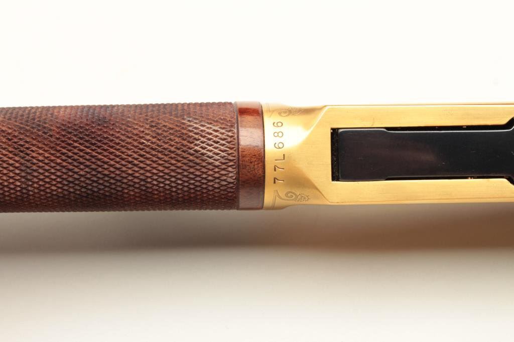 .30-30 caliber with 20” barrels and New Haven address, S/N 77166. Royal blue and gold with etched scene of bear and game. Deluxe checkered stocks. Presentation display case. Fine to excellent with no signs of firing or use. Retail approximately $3,000 in the 80’s. (Modern) Est.: $1250-$2500