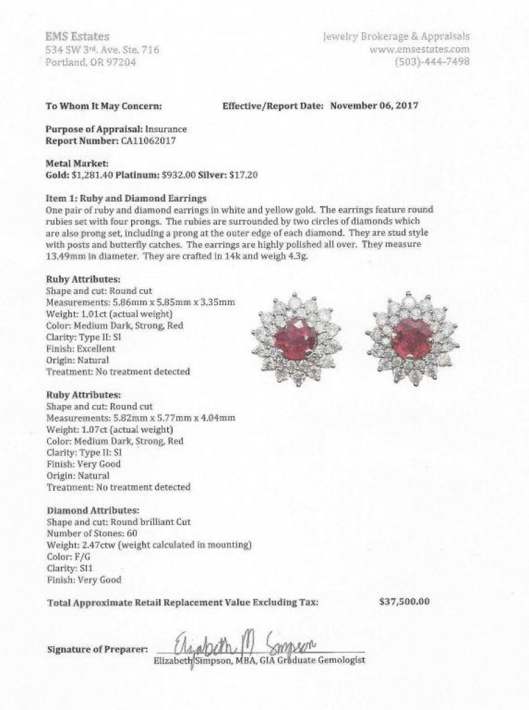 Rubies weighing 2.08 carats and 60 round diamonds weighing approx 2.47 carats of F/G colors in a two tone 14 karat gold setting. Full retail Appraisal at $37,500.00 Est:$8000-15000