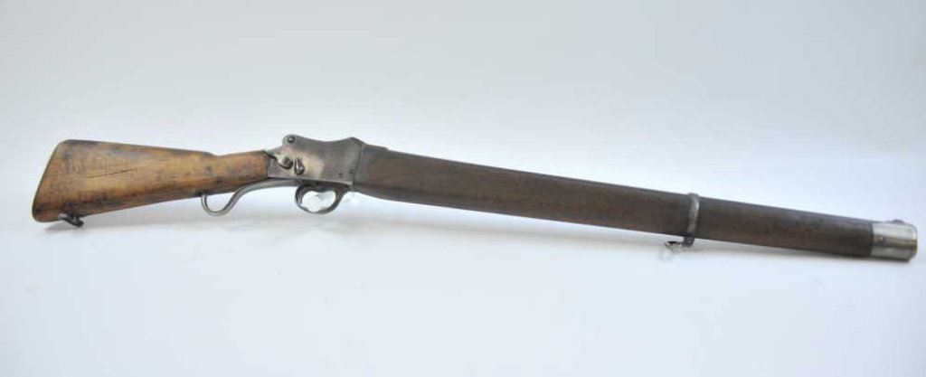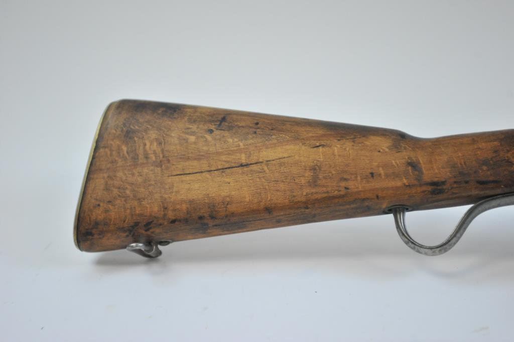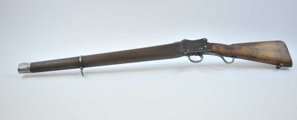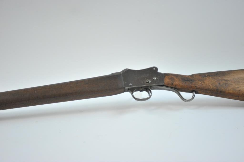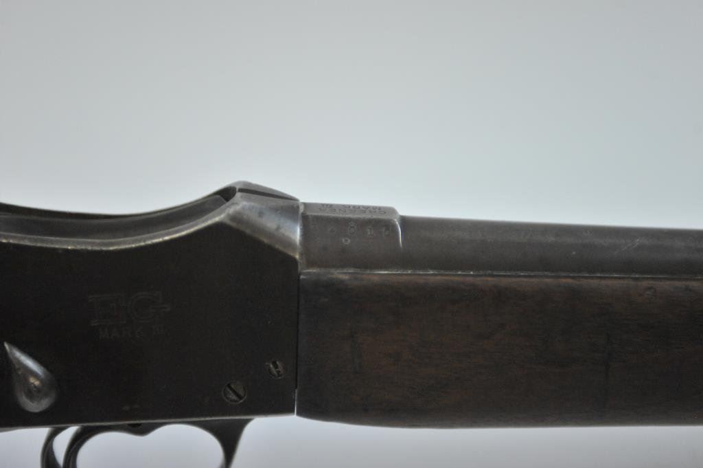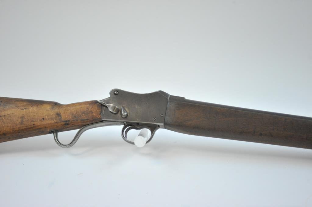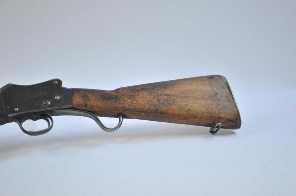 a Martini Enfield style action. The left side is marked W.W. Greener maker PAT. No. 463626/35. Brown to gray patina finish. The stocks are good and sound with some light cleaning to the butt stock, minor staining to fore arm and normal storage and wear. The action is good and the bore is good. Seldom encountered. Est.: $300-$600