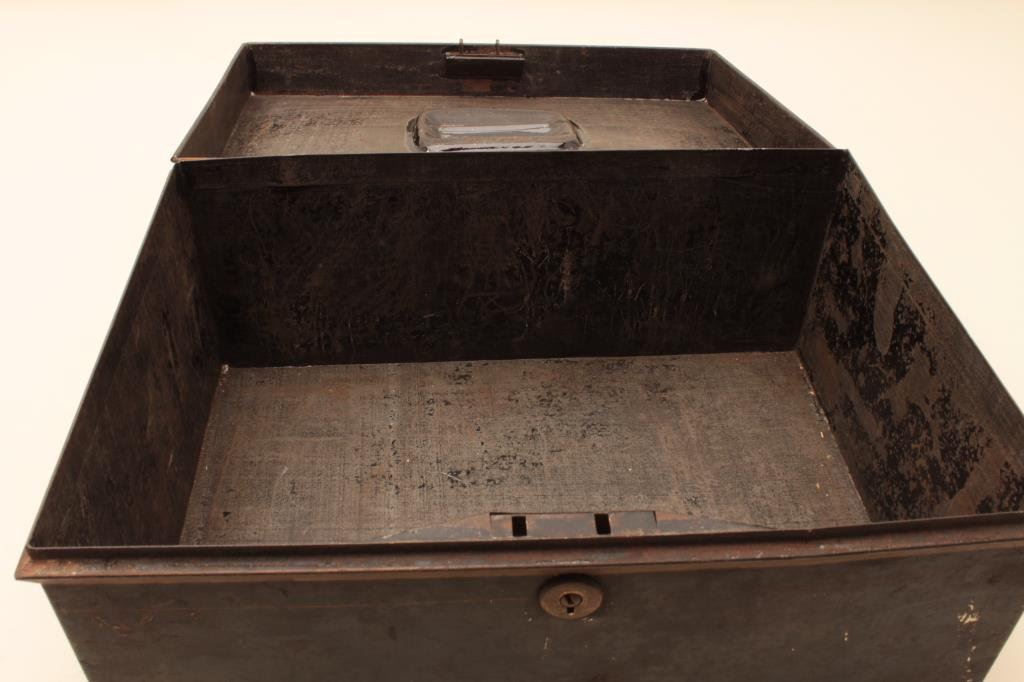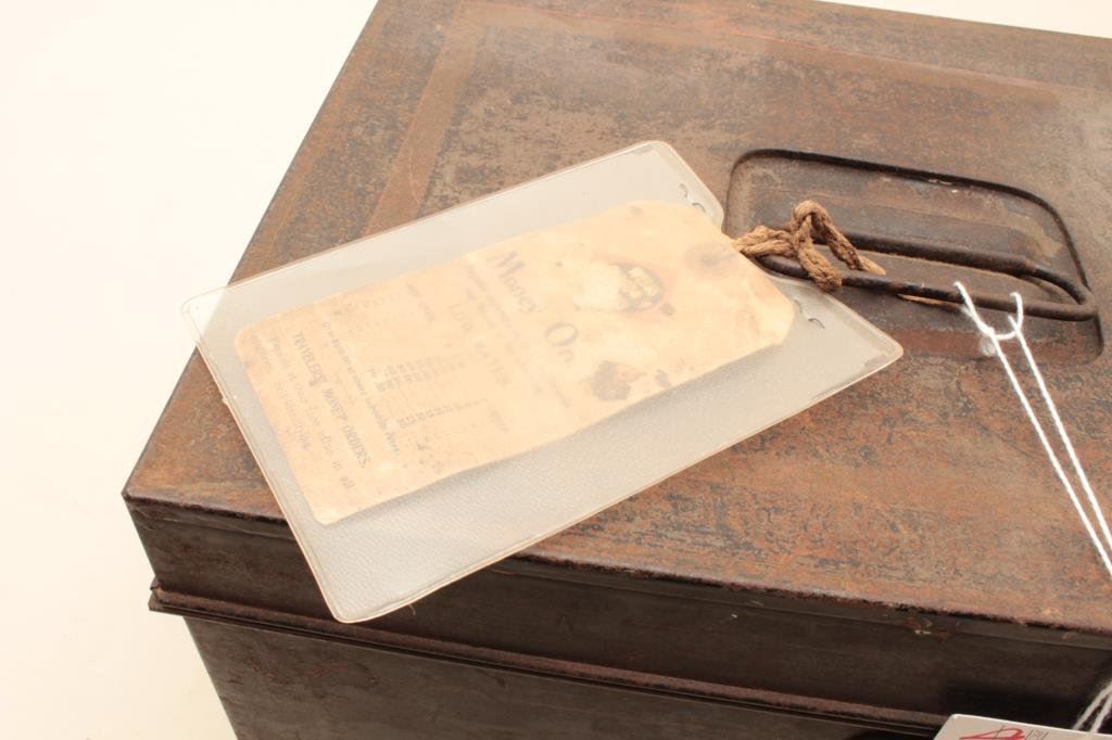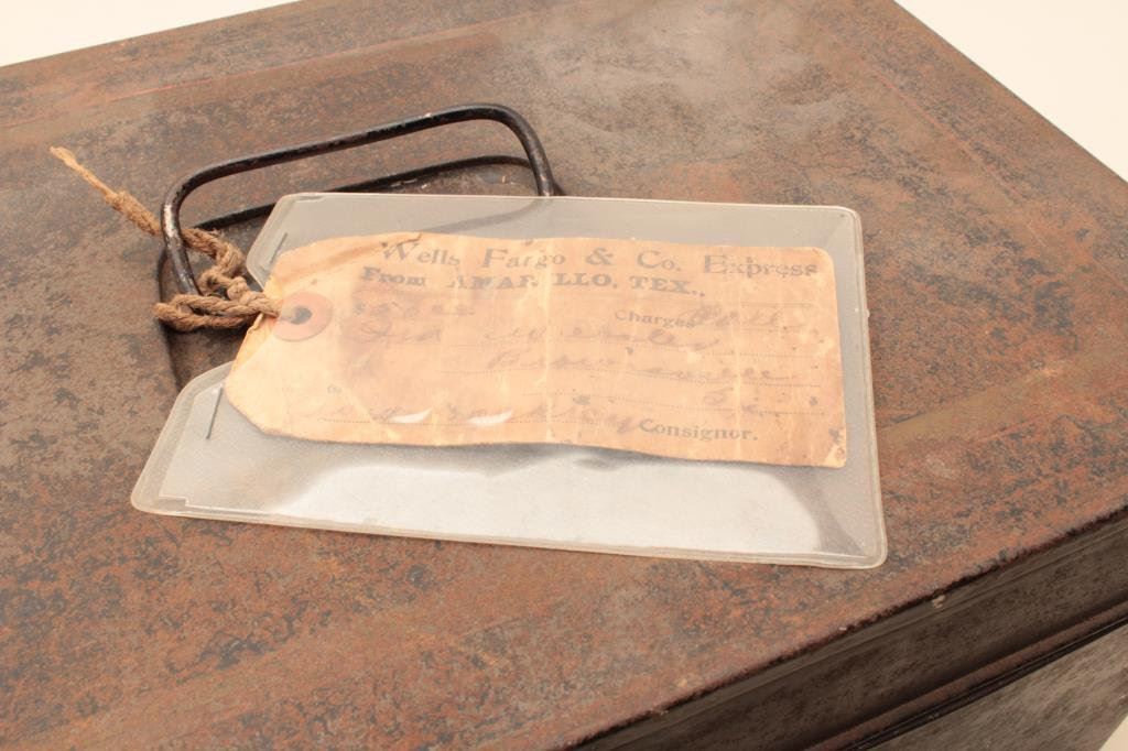 13” width. Wells Fargo shipping tag attached from Amarillo, Texas and notes $50 charges paid. Names of sender and receiver illegible but Brownsville, TX is legible. Probably contained valuable stock certificates, bonds or corporate notes as to high amount charged. Est.: $150-$300