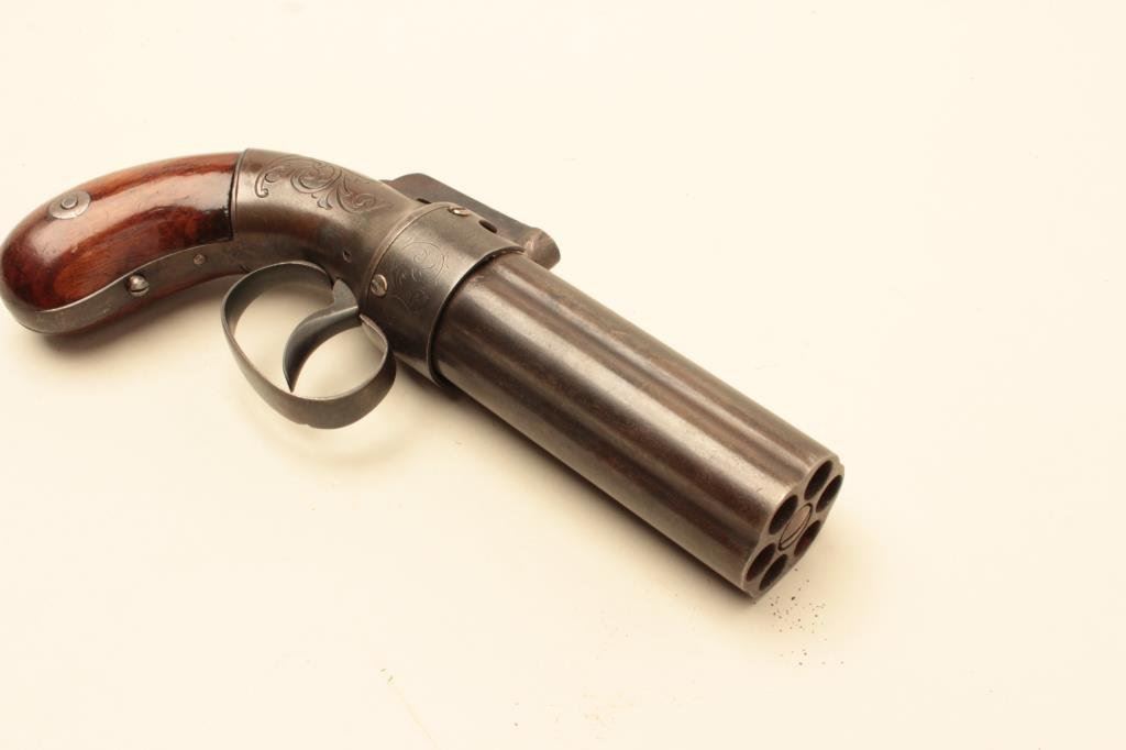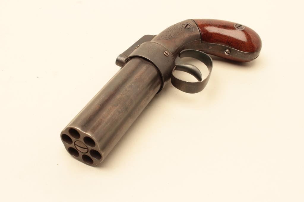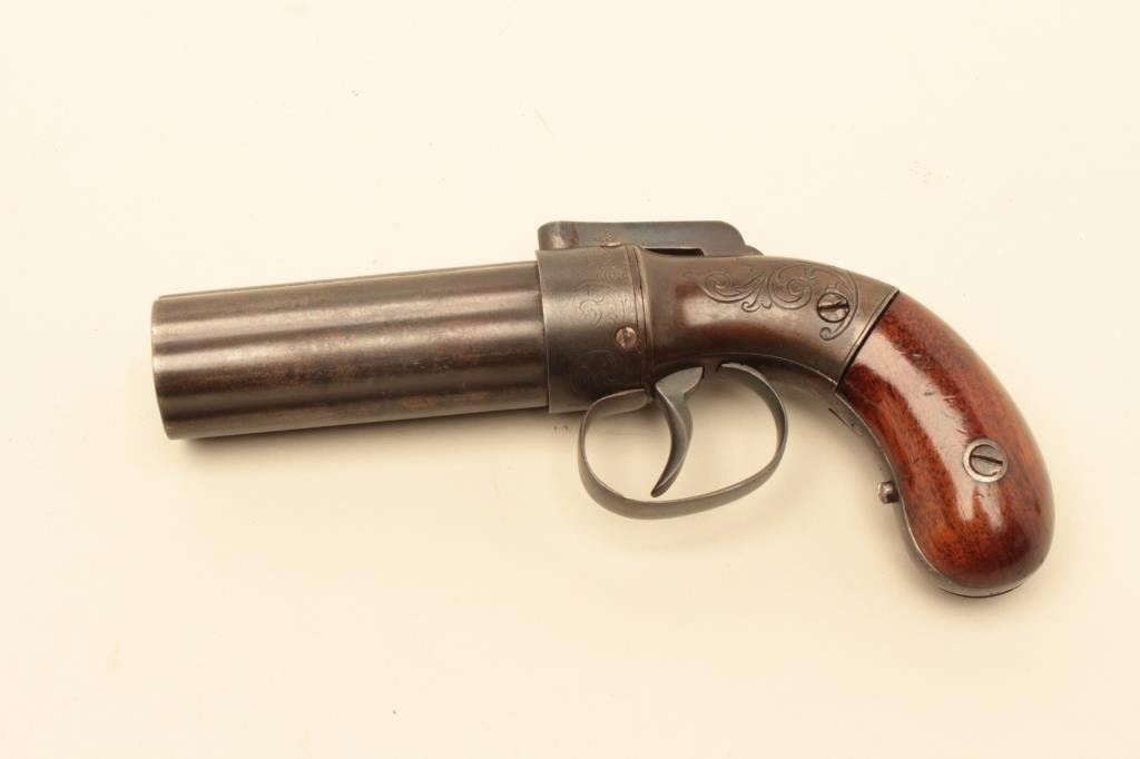 barrel with cap shield of later style (1850’s). Very good condition showing patina with some blue mixed in. Very good plus grips showing most of their varnish. Great action and crisp overall. (Antique) Est.: $500-$1000