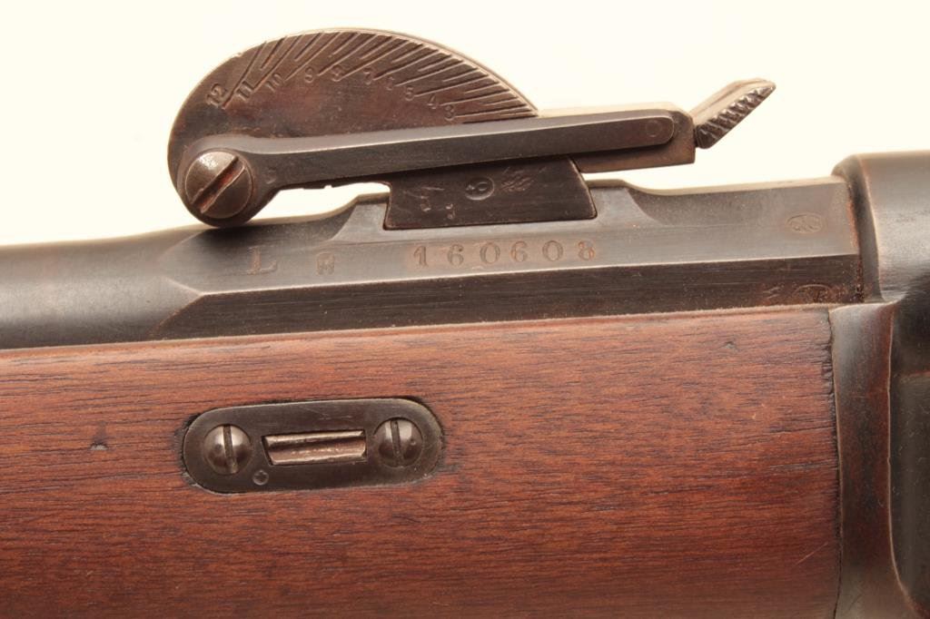 #160608. The rifle is in good overall condition with a 33” barrel. The barrel and receiver retain the majority of their military finish with only storage marks noted. The action is marked, “WAFFENFABRIK BERN” with all matching visible serial numbers. The smooth wood stock is in good condition showing only small mars and handling marks. The butt stock has sling swivels, cartouches on the comb and ends with crescent steel butt plate, also serialized to the rifle. The bore is good, the action is crisp and markings are sharp. (Antique). Est.: $250-$500.