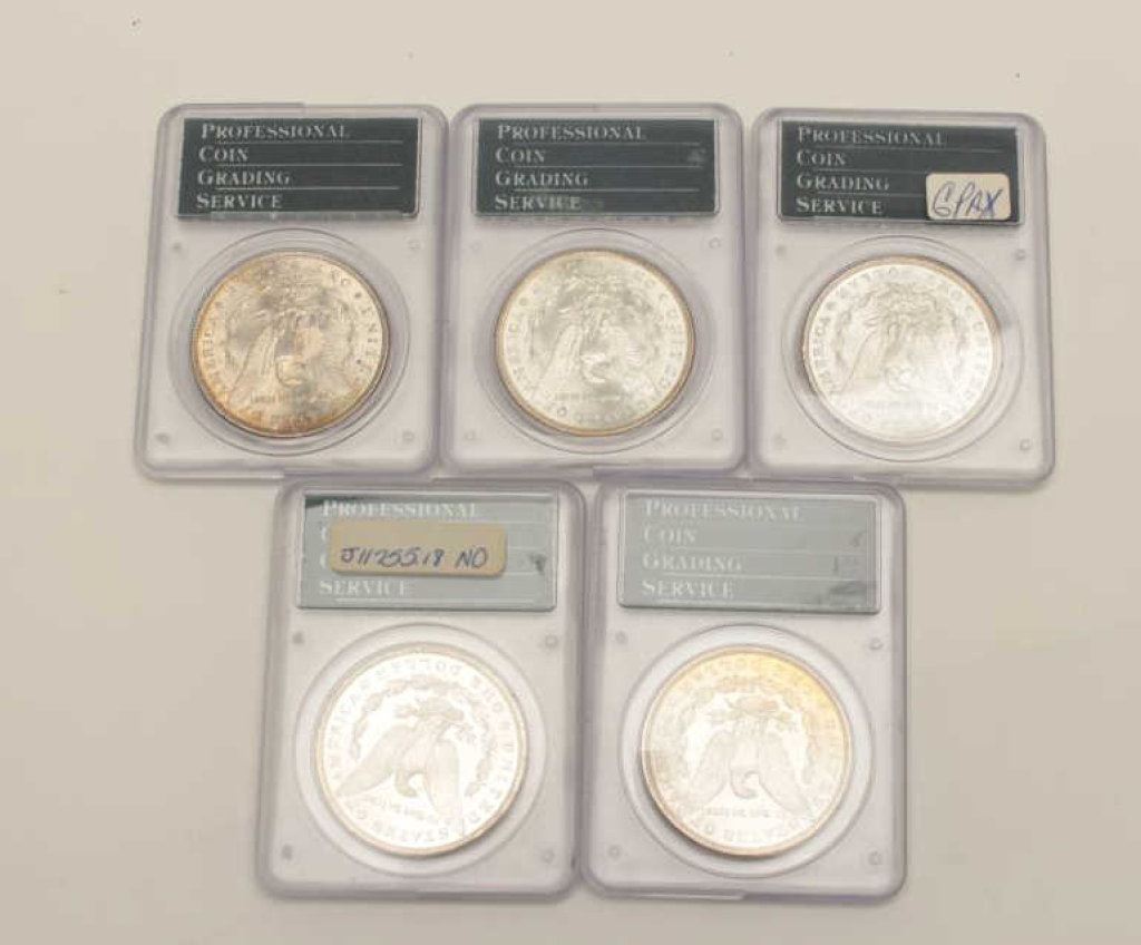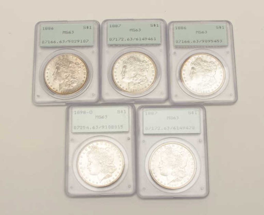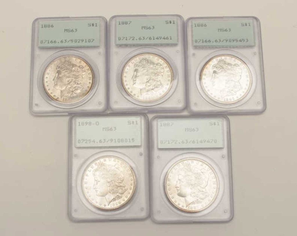 Lot 1325a Mixed Lot of 5 MS-63 Dollars, P.C.G.S. graded 1889-0, 1886,