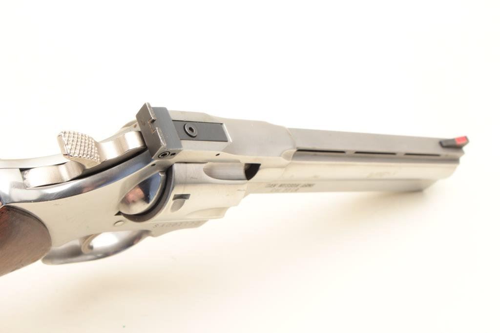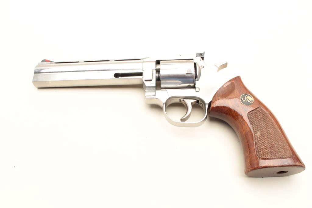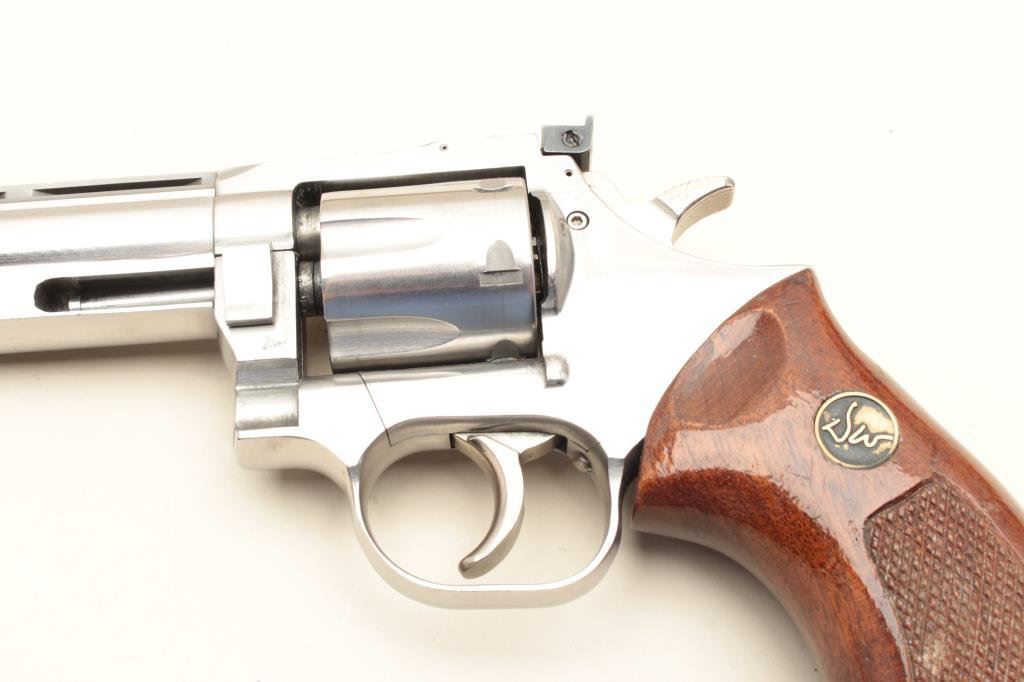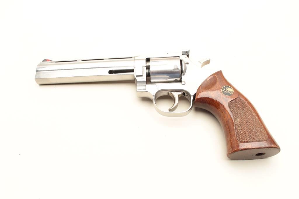 polished stainless, checkered wood medallion grips, S/N SA001120, in overall very good to fine condition with a crisp action, sharp markings, very good + bore and good grips displaying some handling mars and scratches. (Modern/PPT). Est.: $300-$600.