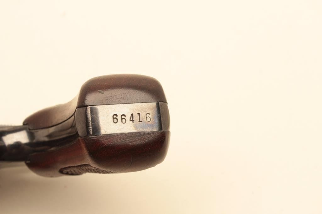 sight, .22LR caliber, 2” barrel, blued finish, checkered wood medallion grips, S/N 66416, in overall fine condition with majority of original blued finish remaining, early flat latch, fine bore, crisp action, sharp markings and fin grips. (C&R/PPT). Est.: $500-$1,000.