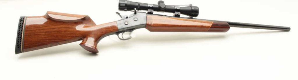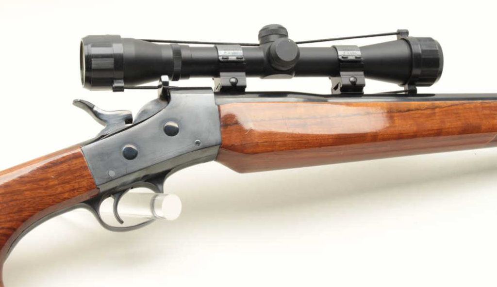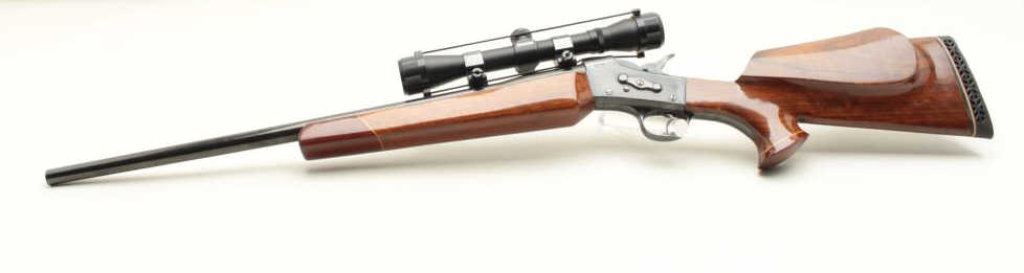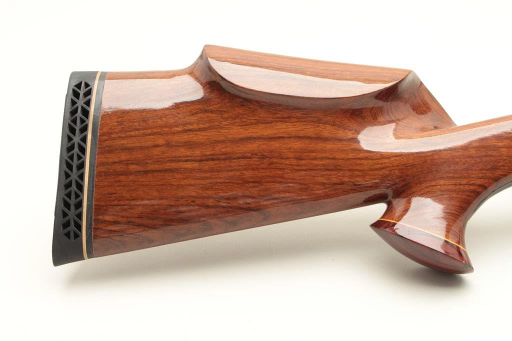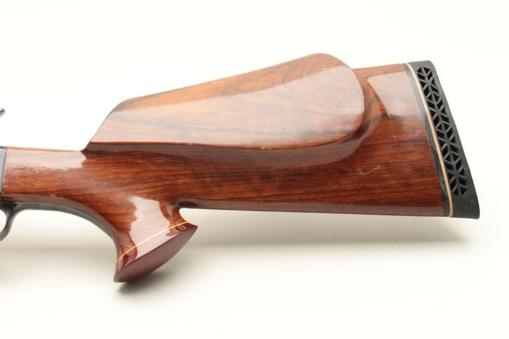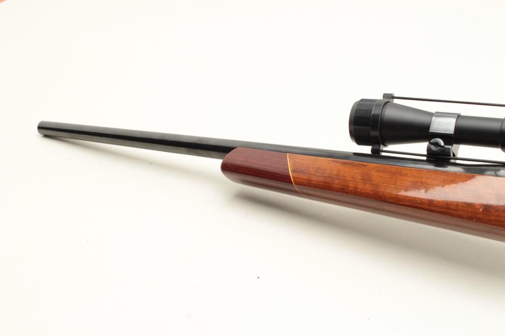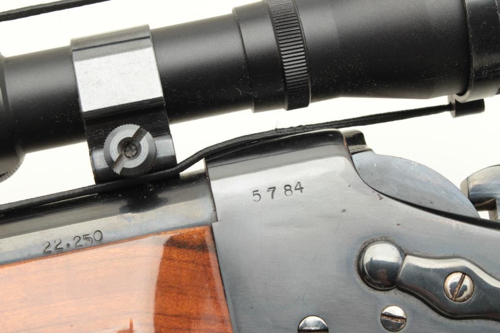 blued finish, custom fancy wood stocks, S/N 5784, mounted with a Simmons scope displaying very good optics; majority of re-blued finish remaining, very good bore, crisp action, very good to fine custom stocks with hard rubber butt pad. (Modern). Est.: $300-$600.