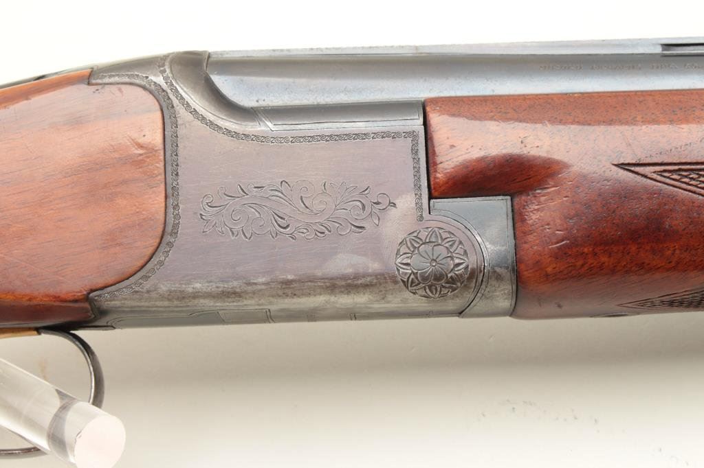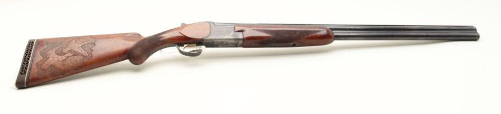 barrels, chokes marked full over modified, single trigger, auto ejectors, 14 1/2" length of pull. Shotgun is in good condition overall, showing the majority of its original finish, stocks are very good with ducks in flight embossed on the right side of the stock. Very good bores, only one barrel is firing at this time. (Modern) Est. $300-600