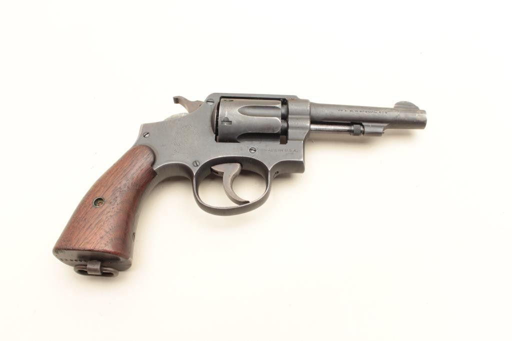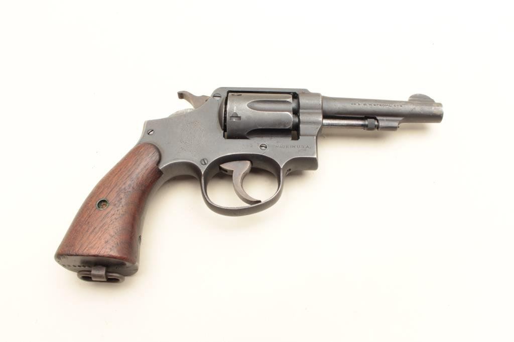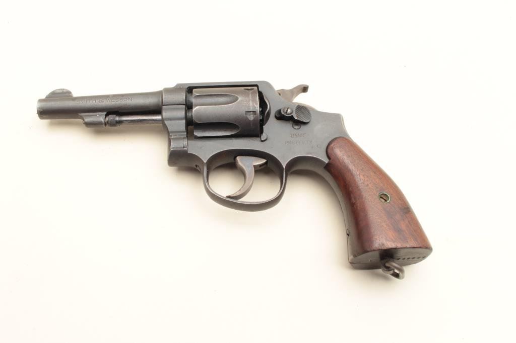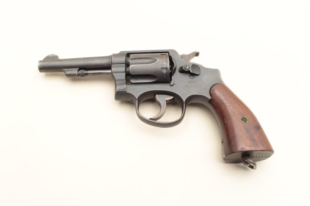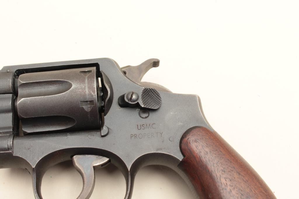 4” barrel, parkerized finish, “USMC PROPERTY” marked on left side of frame (authenticity unknown – not guaranteed); wood grips, S/N V249622, in overall good to very good condition with a crisp action, good markings, very good bore and grips. (C&R/PPT). Est.: $300-$600.
