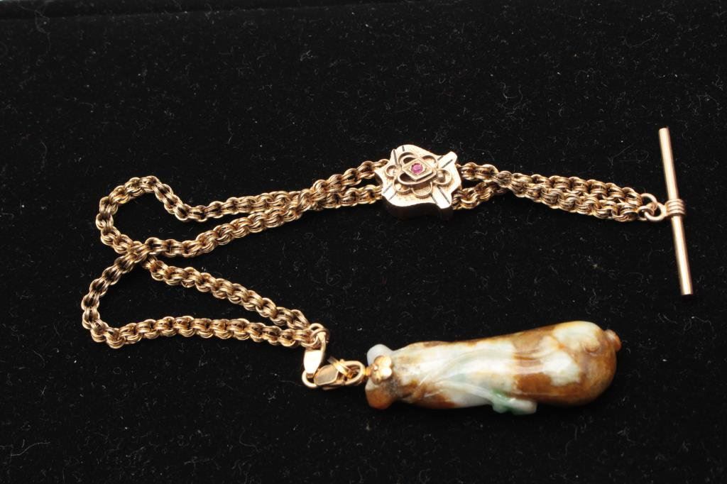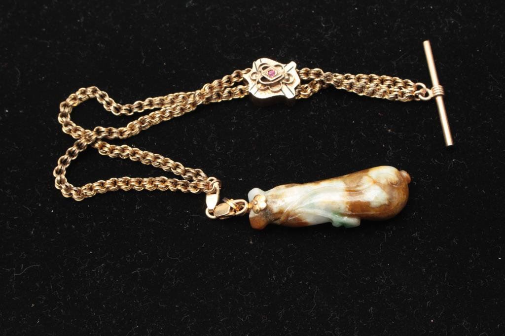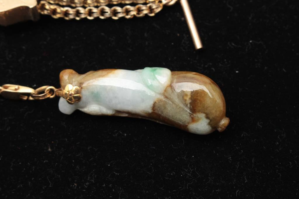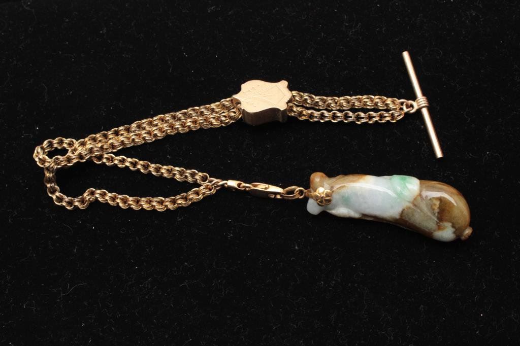 with browns. Gold mount on gold filled antique watch fobs. The jade is exceptional and in our opinion dates pre-1900. The watch fob is 1920s or before.Est.: $150-300
