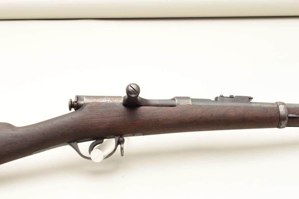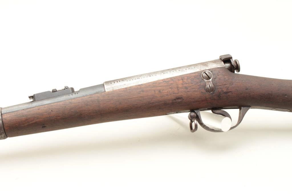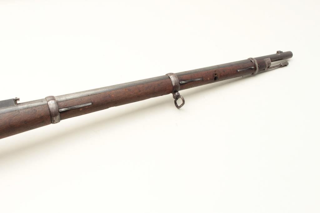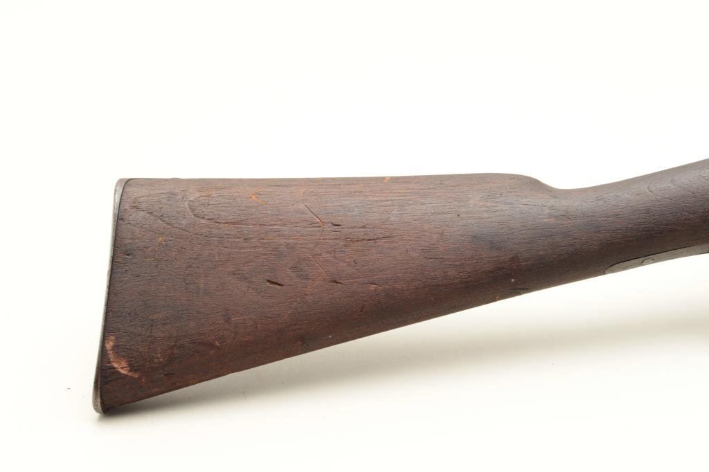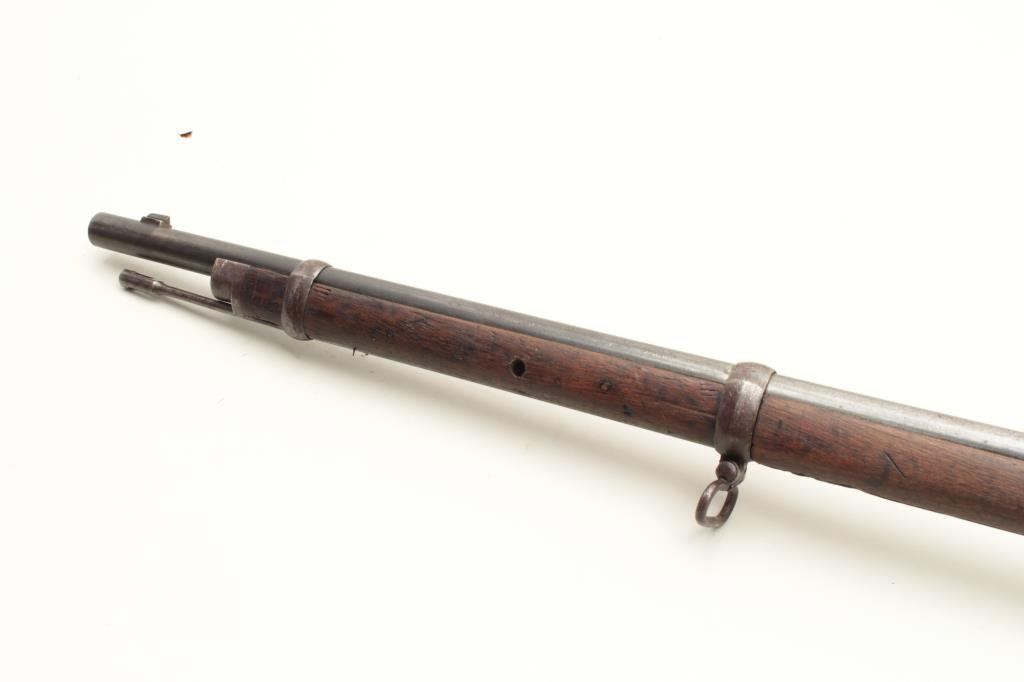 46” overall. Mum on the breech with arsenal stamping and #4191 on the action and barrel. Long inscription on the left side of the action (Consignor’s note mentions Naval academy but we have no verification). 30%-50% toning blue on the barrel. The stock is weathered and worn remaining only fair. The action is good, the bore is shiny but rifling is worn almost smooth from use. Interesting. (C&R) Est.: $350-$700