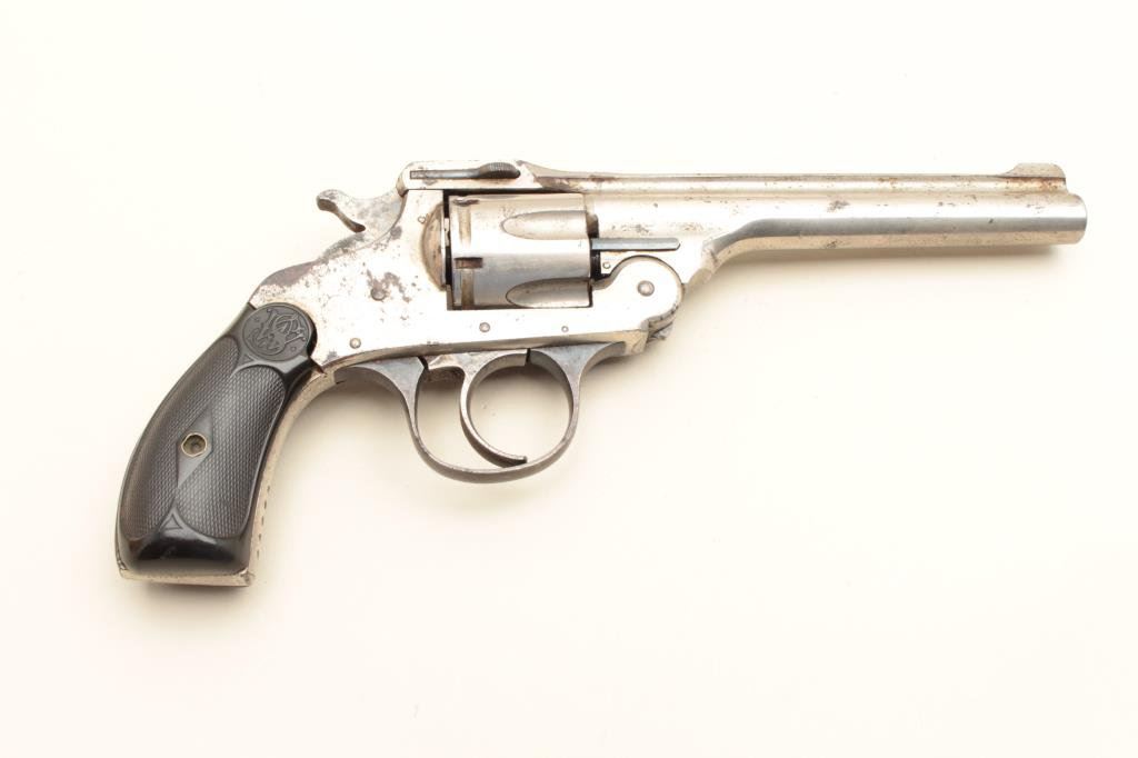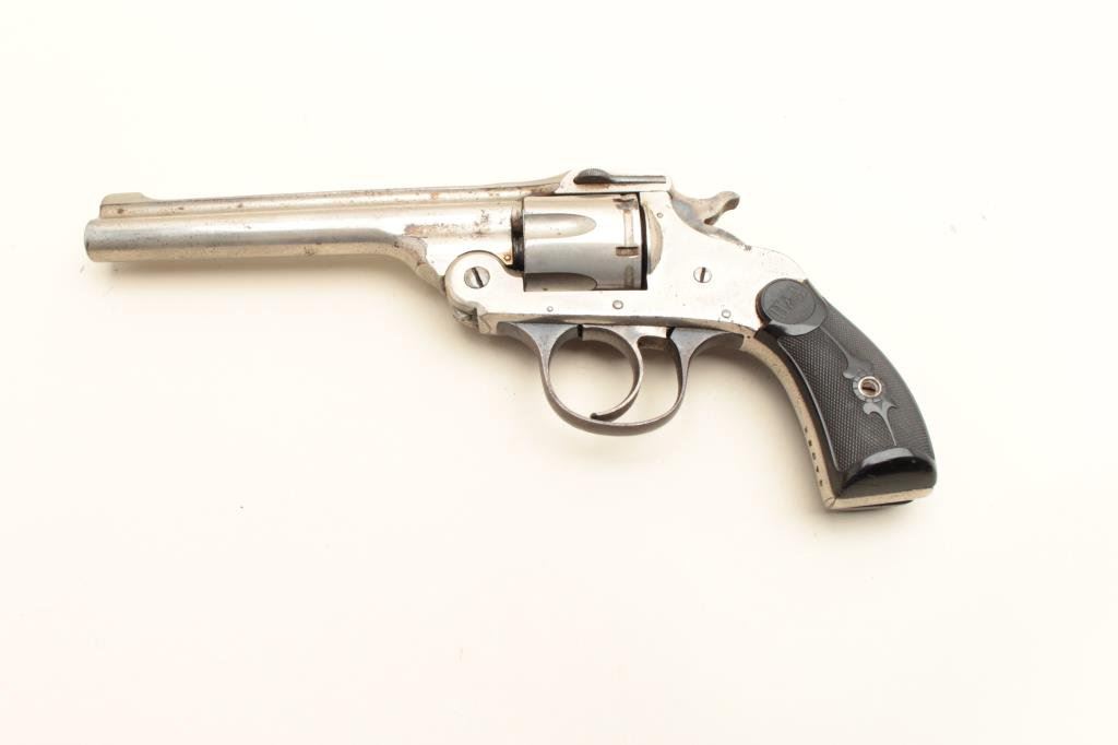.32 caliber, 5” barrel, nickel finish, checkered hard rubber grips, S/N E2079, in overall good condition showing the majority of its original frosty nickel finish, good action and markings, dark bore, good grips (one H&A marked, the other S&W marked). (C&R/PPT). Est.: $150-$300.