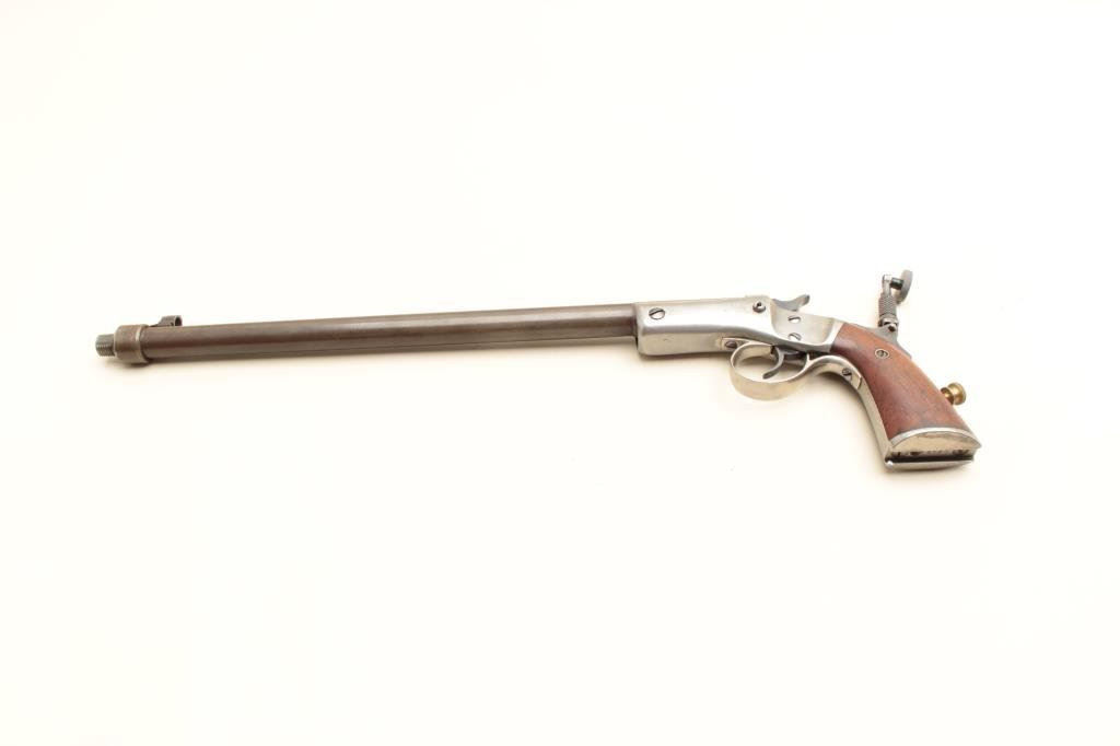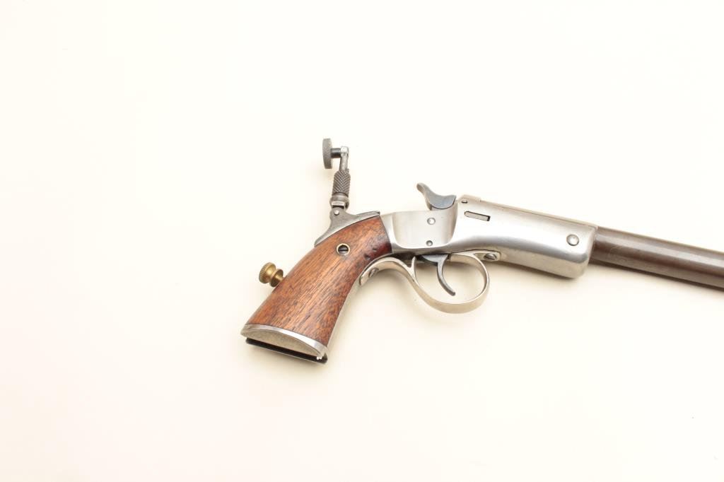 Lot 1849 Stevens tip-up single shot pistol, .25 caliber, 13 barrel, wood