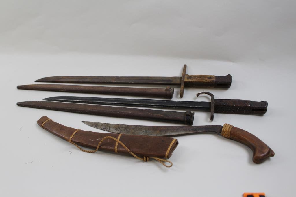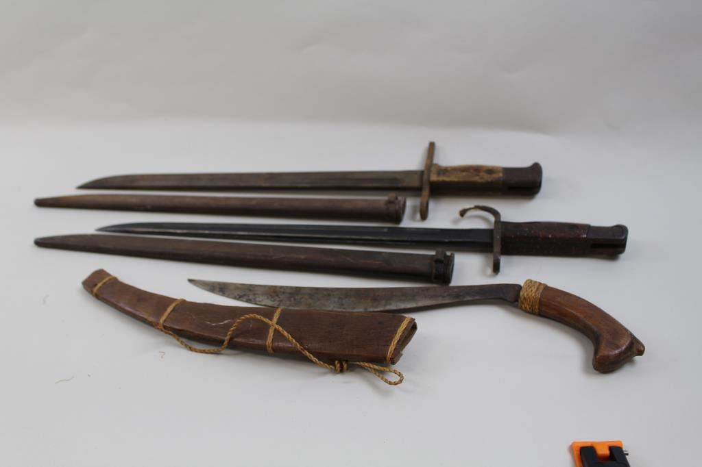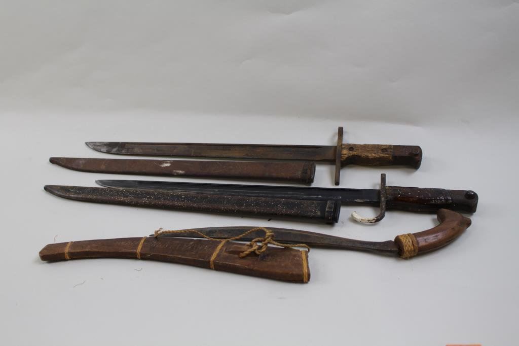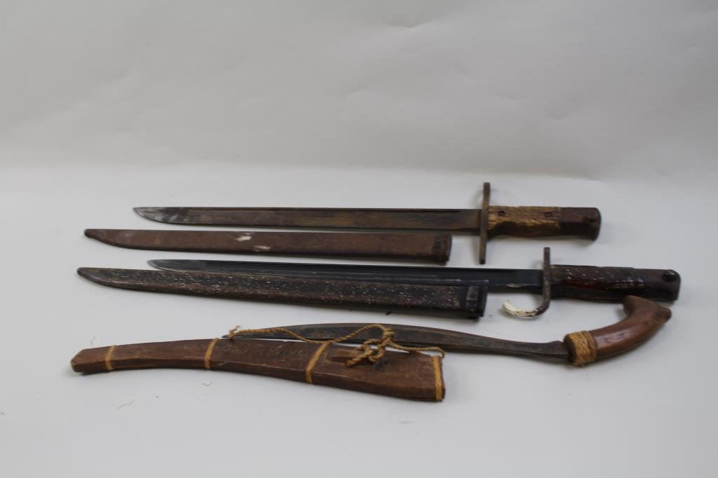 good to very good condition, showing paint splatter on the scabbard and handle , blade is near fine. Second is an early type 30 in fair condition, third is a Philippine knife in good to very good condition with wooden handle and wooden sheath, all WW II bring backs. Est $100-200