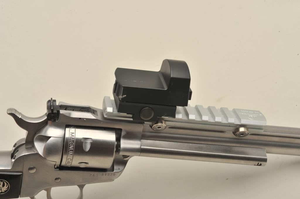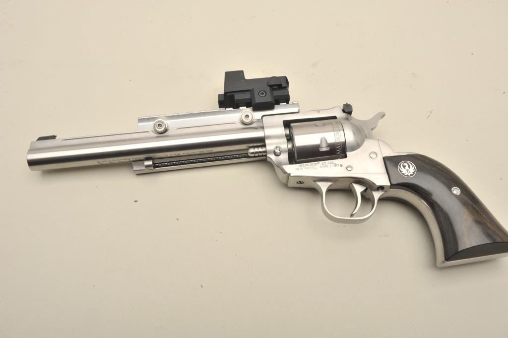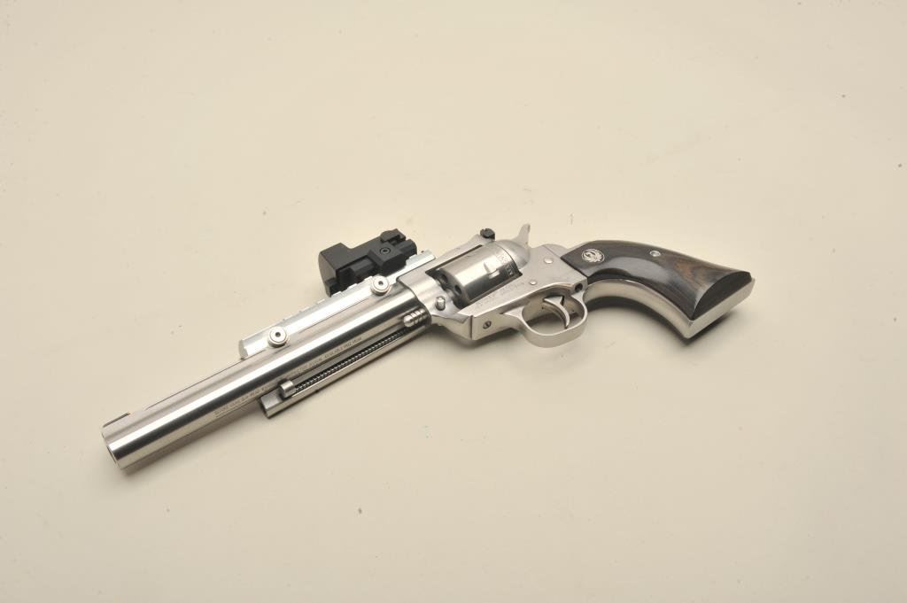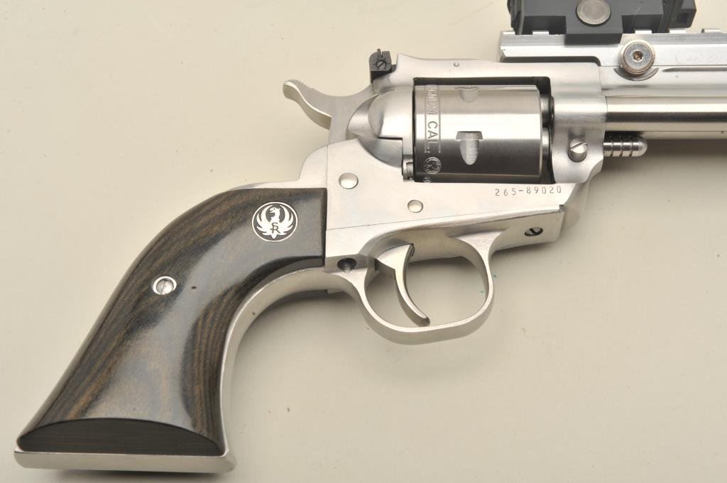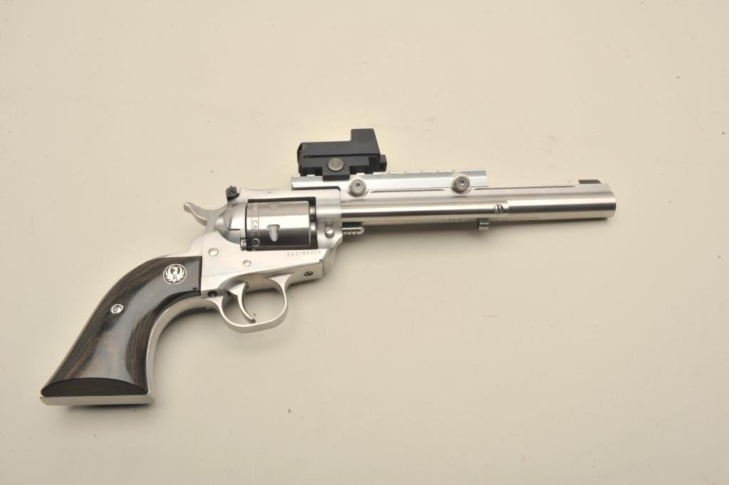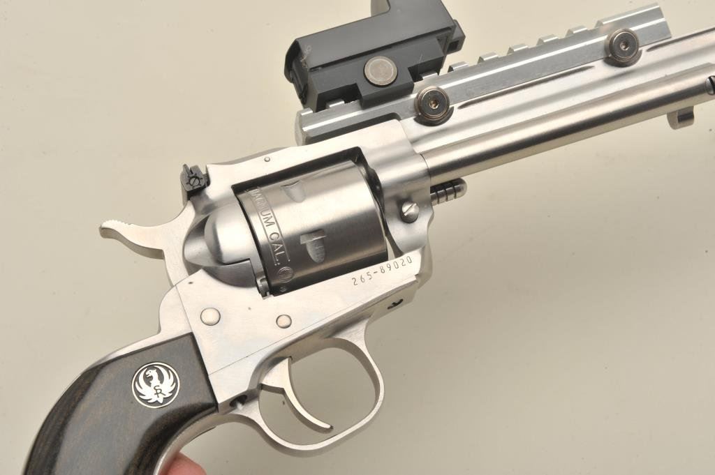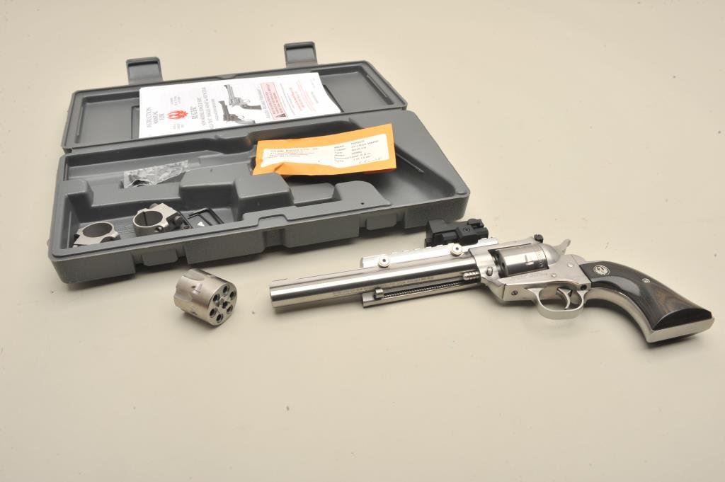 .22 Mag dual cylinder, 7 1/2" barrel, laminated wood grips, in excellent condition overall with Accelerator red dot sight on a Weig-a Tinny billet mount. In original box with paperwork and scope rings and paperwork. (Modern/PPT) Est $275-550