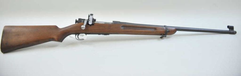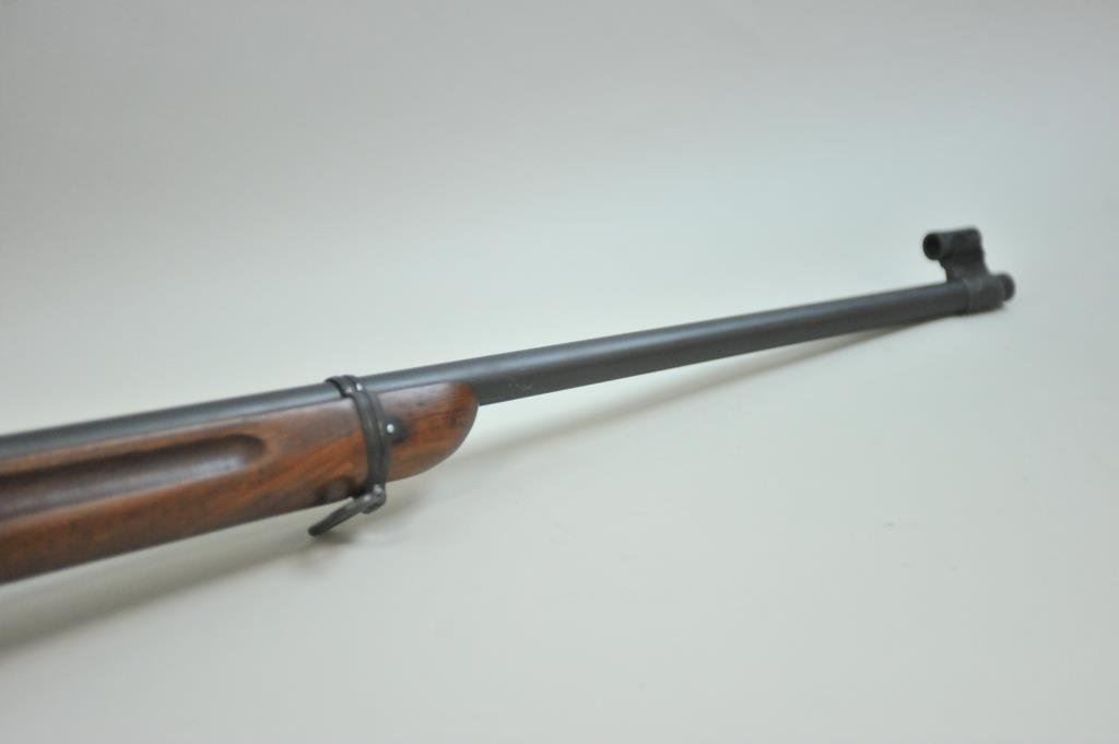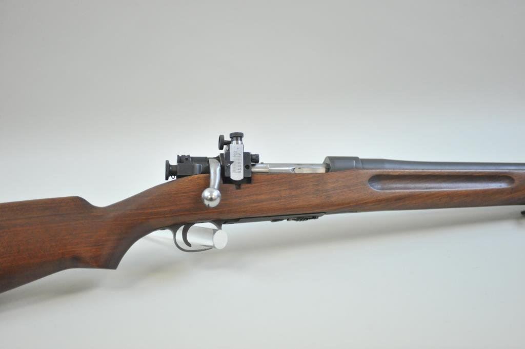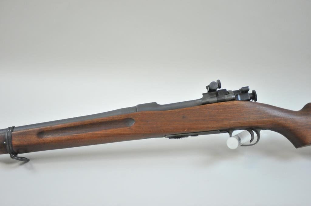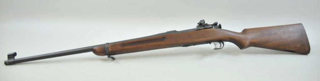 Arsenal, S/N 16467B. The barrel is dated 12-33 and Springfield marked. The metal shows most original arsenal finish. Two small tap holes and screws in the action and at the rear of the barrel. Lyman rear and front sights added. Small marks on the pistol grip (Not readable but 2 initials like inspection). Sling swivel (Rear) and butt plate are missing. Marked bolt and original mag. The bore is bright. Two small parts would kick up value dramatically. (C&R) Est.: $350-$700