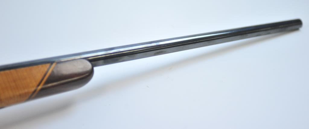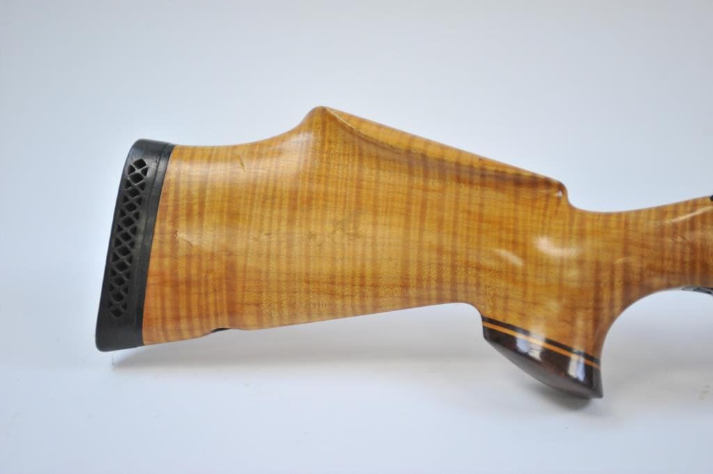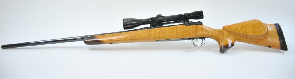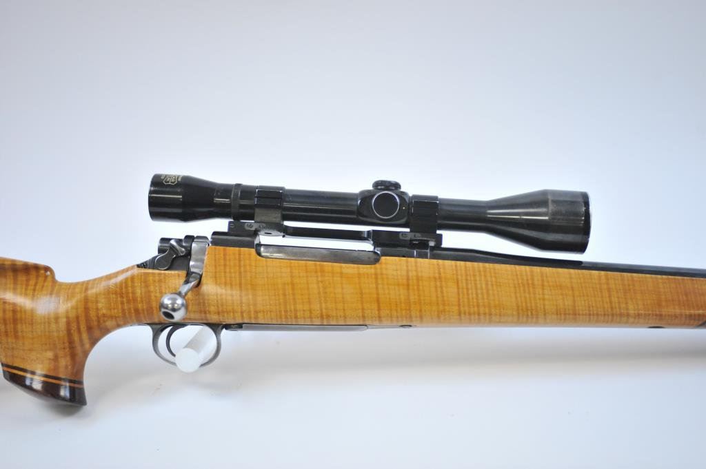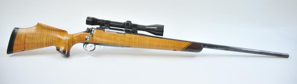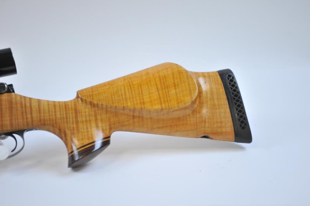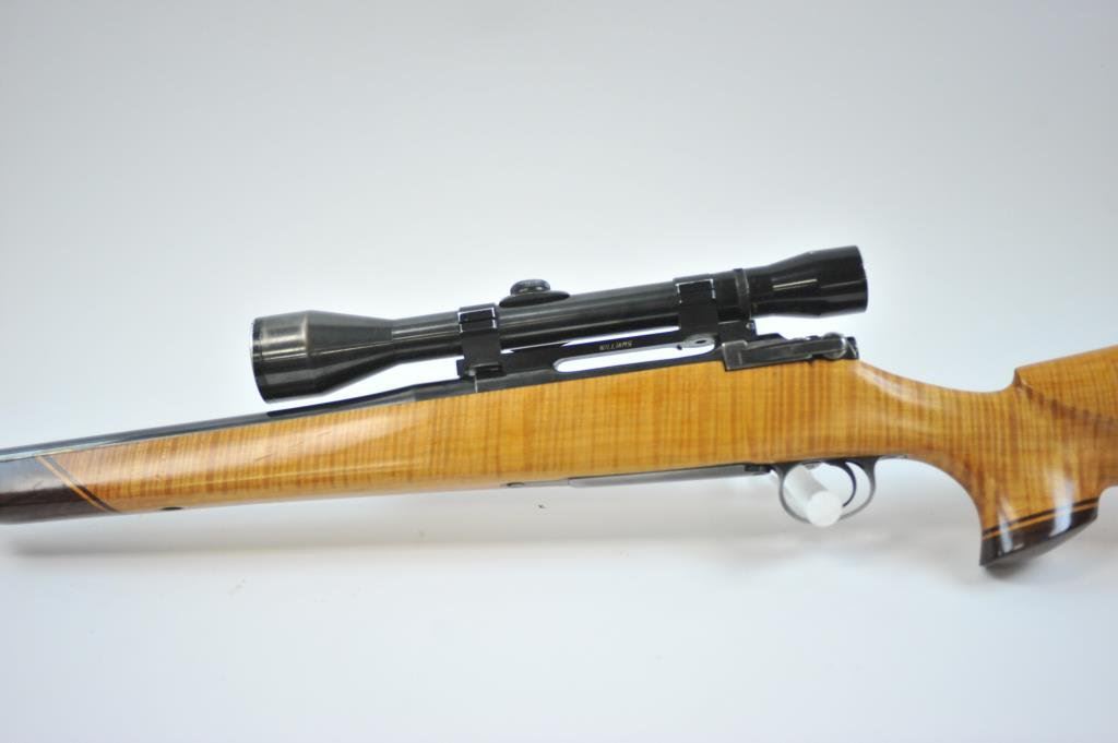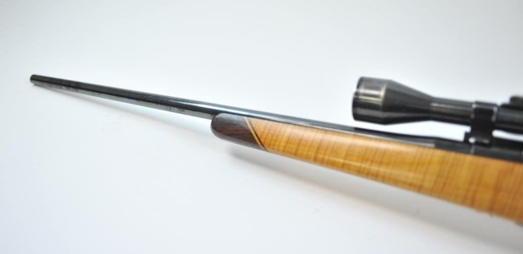 Mag cal, beautiful AAAA flame maple stock with rosewood caps. Mounted with Pecar 6x59 scope on Williams mount. Made in 1962. Fine to excellent condition, vintage styling. (C&R) Est $600-1200