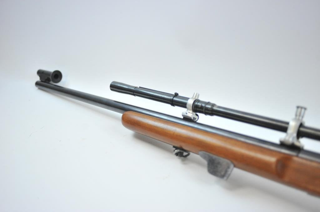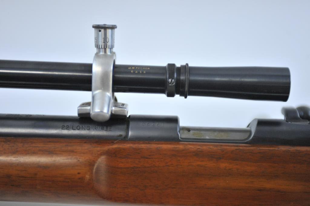 Fecker target scope and matching mounts, S/N 06261. Iron target sights included with adjustable sling and trigger. Fine to near excellent used condition. 96%-98% blue. The stocks show minor handling. Excellent bore. Heavy 28” barrel. (C&R) Est.: $700-$1400