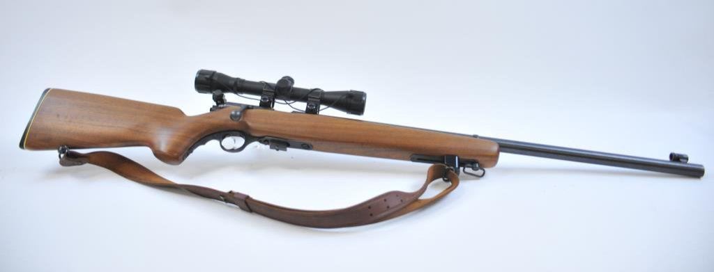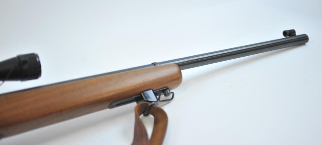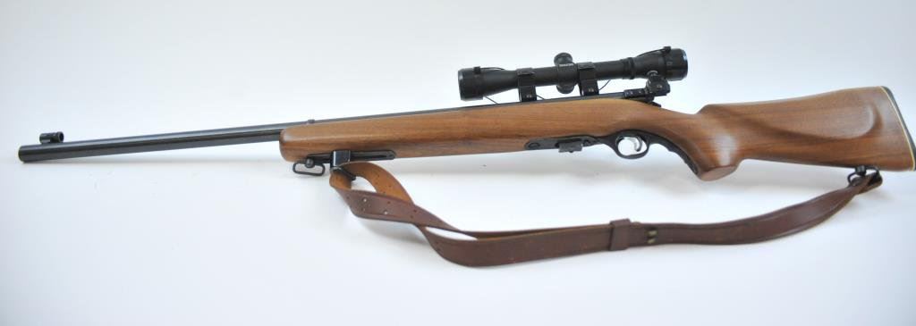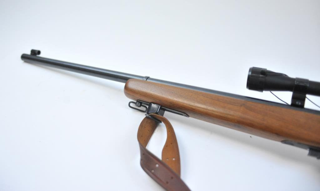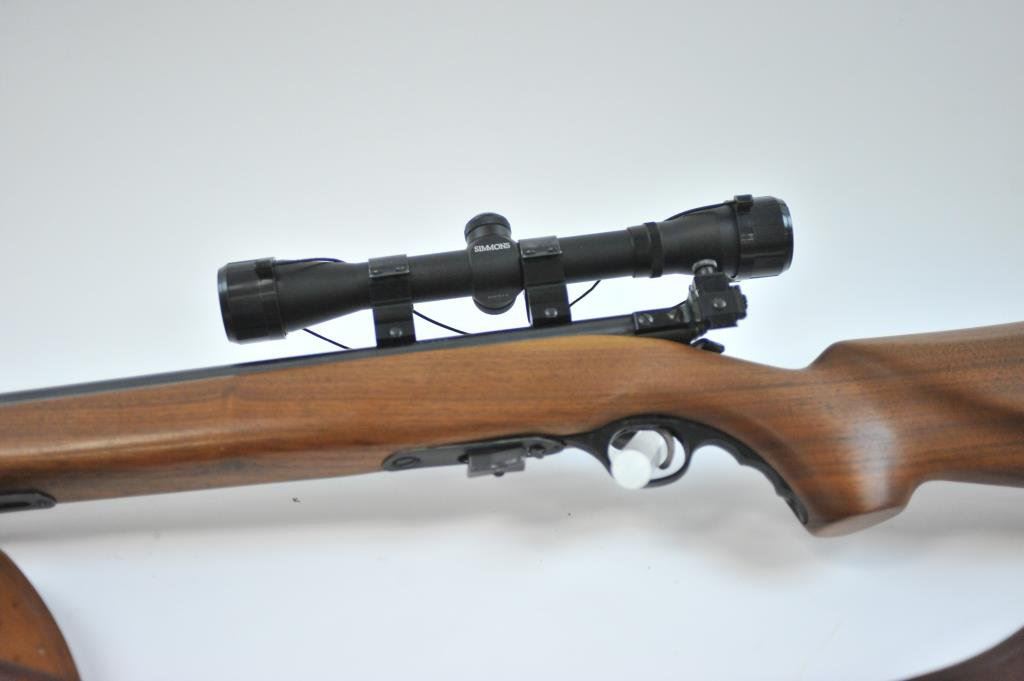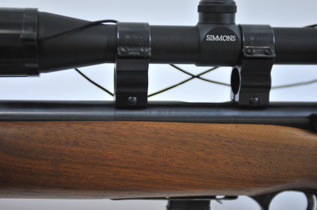 591595. Heavy round 26” barrel, adjustable front swivel, Mossberg tang and target front sight. Simmons scope on weaver mounts in factory grooves. Fine to excellent overall. 97%-99%. The wood is also about fine. Est.: $250-$500