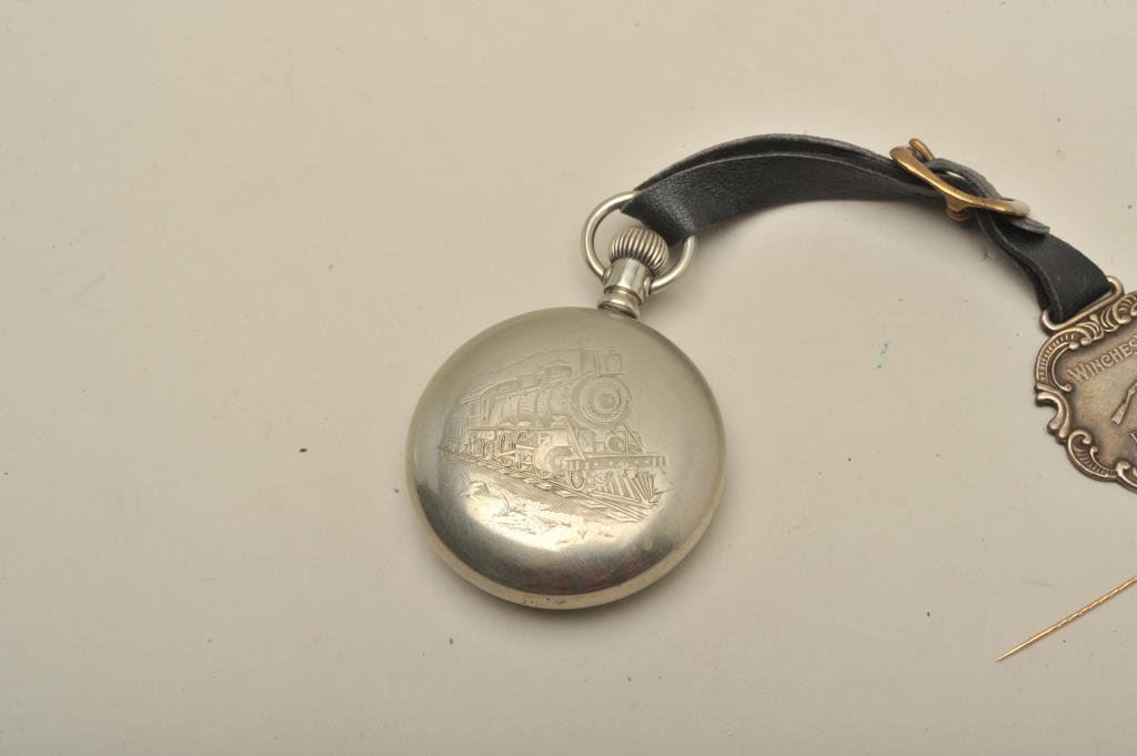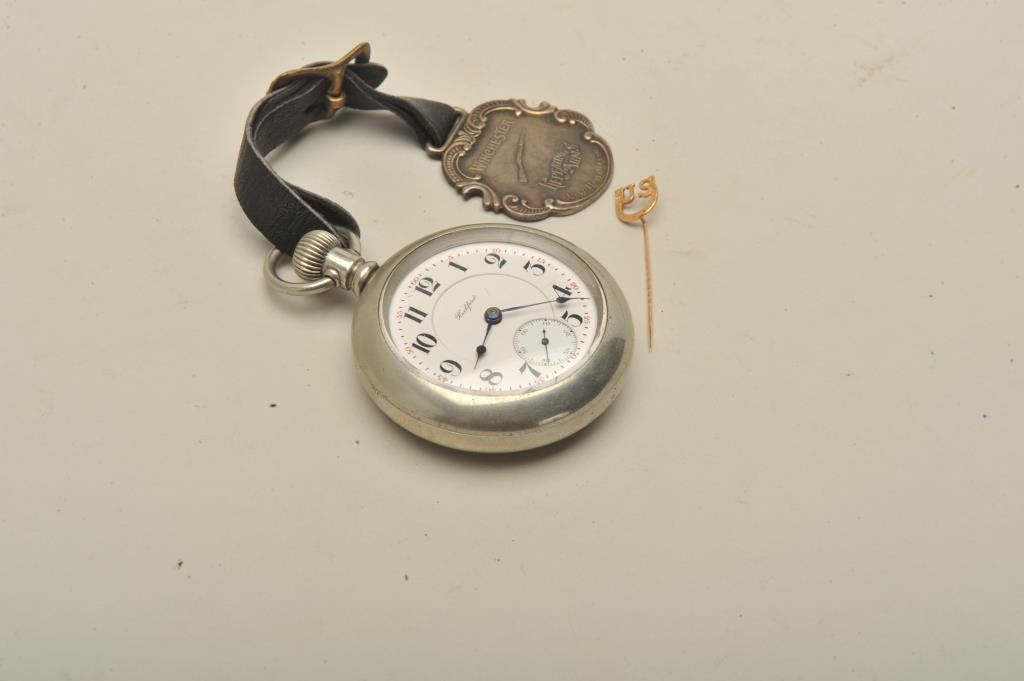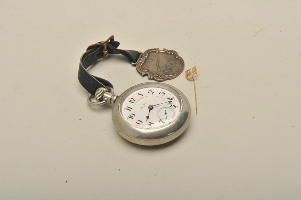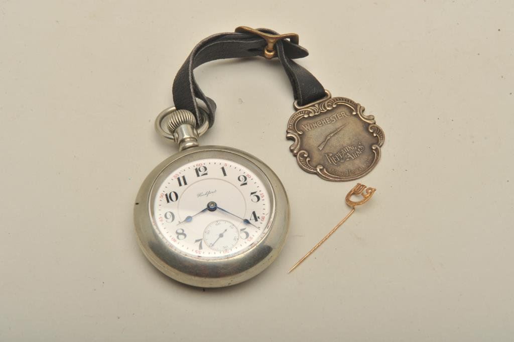 signed, movement engine turned, silver case by Phila-Watch Case Co. with Winchester Fob and U.S. Cav. Tie tack or pin in rose gold. Est:$150-300