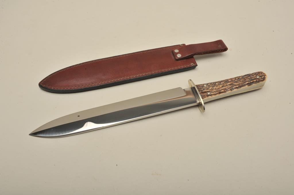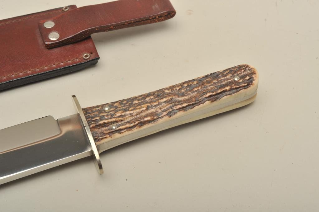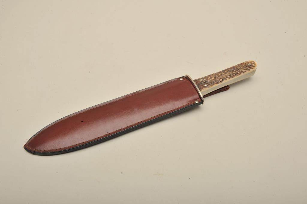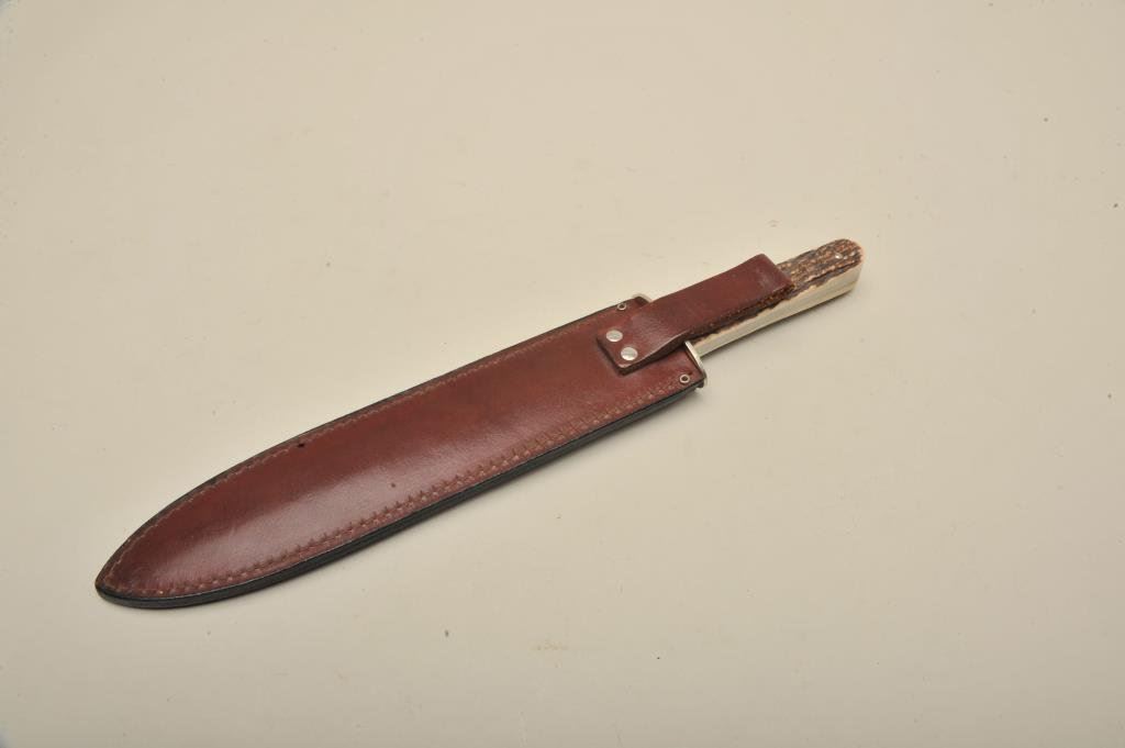 Case bowie 10 blade, 15 overall w/ scabbard. Near Fine.