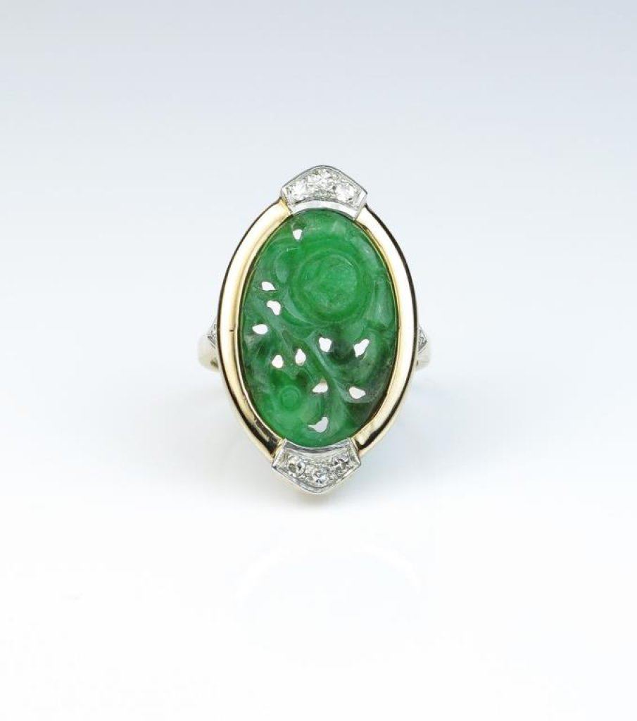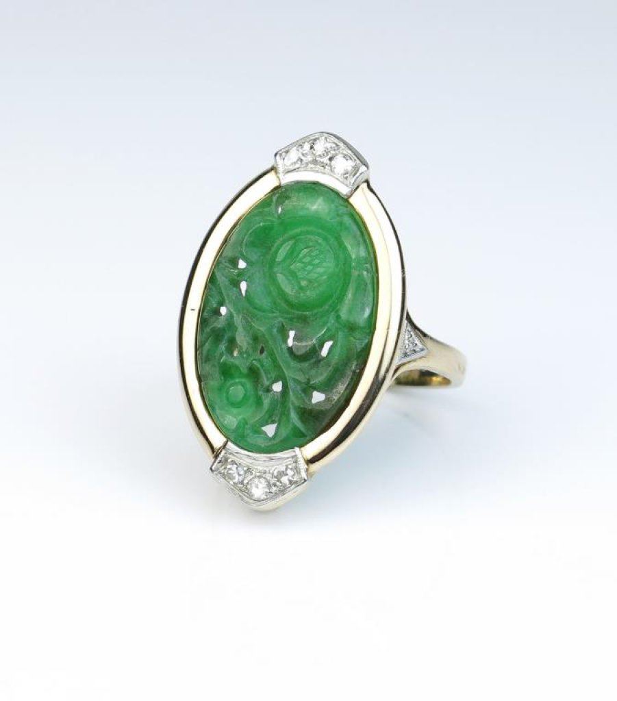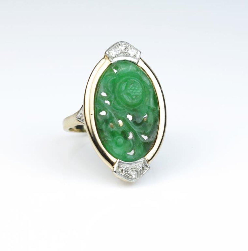 Exquisite ladies Vintage ring featuring a carved green Jade(possible NO treatment) and side diamonds set in 14 karat yellow gold antique setting. Retail:$3000-$4000 Est:$1000-2000