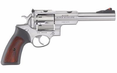 Ruger, Super Redhawk, Revolver, Double Action, 10MM, 6.5" Barrel, Satin Stainless Finish, Rubber with Hardwood Insert Grips, 6Rd, Adjustable Rear Sight & Fixed Red Ramp Insert Front Sight, 3 Full Moon Clips