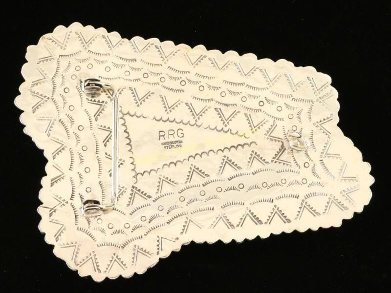 Large piece of striking blue green turquoise carved into the image of an eagle's head surrounded by sterling silver. NIce matrix with mother of pearl inlay for eye. Marked "RRG' and "Handcrafted Sterling" Measures 5"l x 4"w