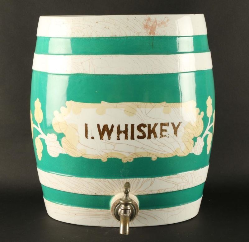 English Mid 19th Century. White ceramic with teal stripes. "I.Whiskey" in gilt with floral and scroll accents. Cracks in glaze on front otherwise good. Includes lid and spigot. Measures 12 1/2"w x 8"w x 15 1/2"h.