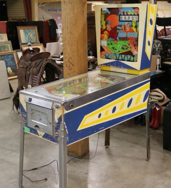 25 cents for 2 plays, very colorful graphics of people playing pool, 1960's-70's Era. In good working condition.