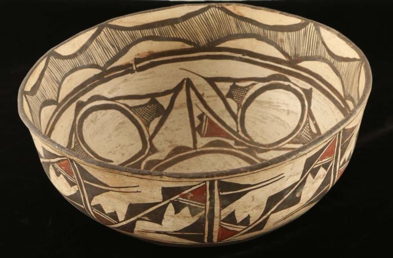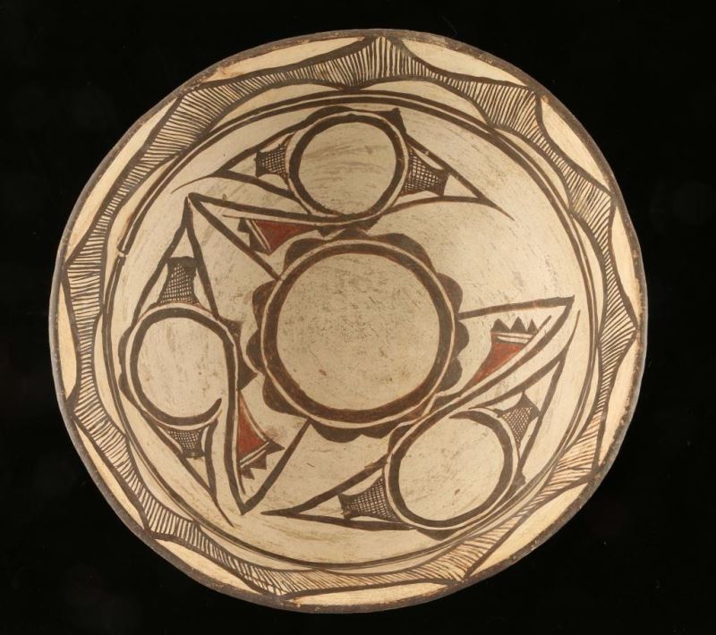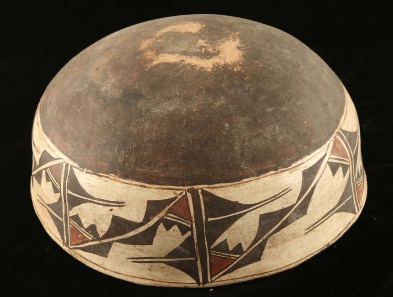 Very nice polychrome finish with a geometric pattern. Near fine condition for its age. Museum quality piece from a noted Scottsdale, AZ collector. Measures 6"h x 14"dia.