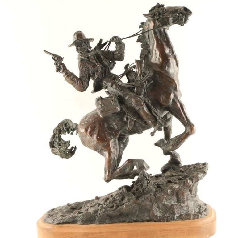 This beautifully fabricated bronze statue "Heading to the Hole" by J. Collender is #10 out of 12 made; therefore, it makes this sculpture a highly sought after collectible. Bronze is considered to be the most popular metal for cast metal sculptures. Most often, a cast metal sculptures is simply called a "bronze". This Bronze statue is 21" inches tall, 14-1/2"inches wide at the center with a 16-3/4" inch wide base. Signed 10/12 "Heading to the Hole" by J. Collender. Noted as a leading authority on the West, James Collender demonstrates his expertise in his paintings and sculptures. His subject matter pertains to the West in both the past and present. Art collectors and celebrities around the world have acquired his works for their collections. His other noted works include illustrations for a number of publications in New York and his position as a background director for the animated movie, "The Night Before Christmas".