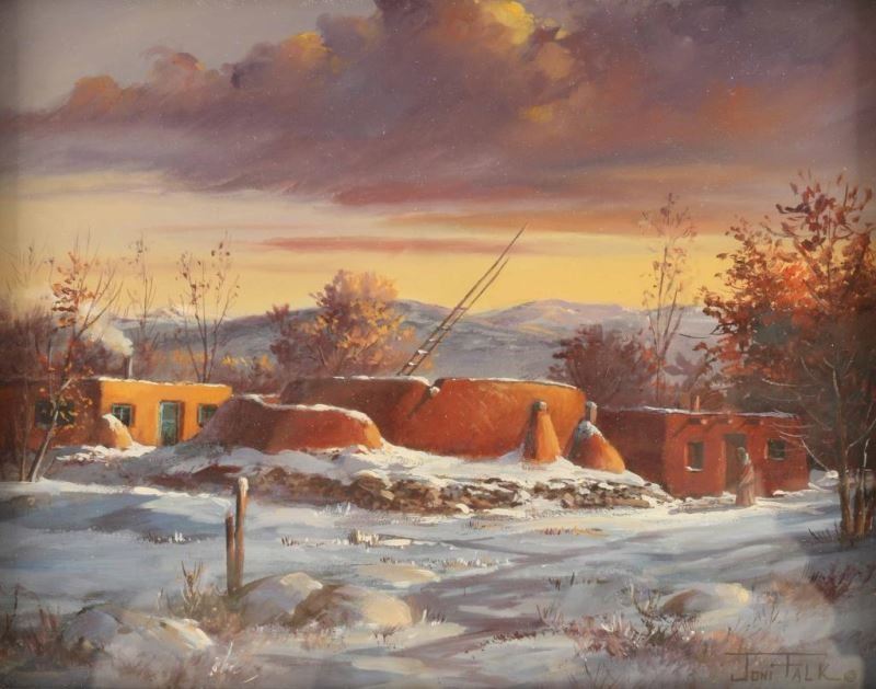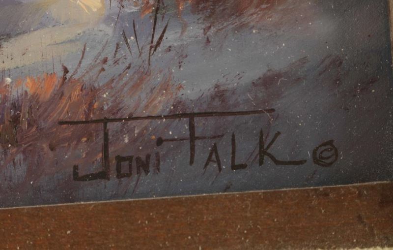 "Kiva Serenity" signed lower right. Image measures 7 1/4"x9 1/4" in wood frame with suede mat and wood insets. Includes brass title plate. Joni Falk realist painter of still life and landscapes, has lived in Phoenix, Arizona since 1960. She grew up in Chicago, and graduated from Marquette University in Milwaukee, Wisconsin. It was the Southwest culture and history that compelled her to seek a full-time career in the field of art. She has become known for traditional floral still lifes, western still lifes, Pueblo or Plains Indian landscapes and Indian figures. Falk's exhibitions include The National Museum of Wildlife Art in Jackson, Wyoming; the Albuquerque Museum, Albuquerque, New Mexico; Cheyenne's Old West Museum; The Tucson Museum of Art, Tucson, Arizona; and the Desert Caballeros Museum in Wickenburg, Arizona; the McAllen Museum, McAllen, Texas; and the Phippen Museum, Prescott, Arizona.