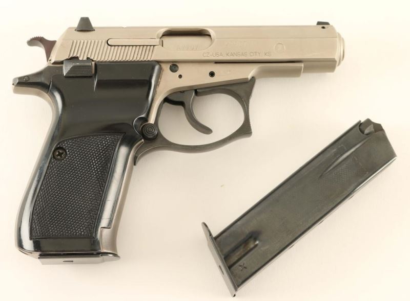 Czech made double-action semi automatic compact pistol chambered in .380 Automatic. Satin silver finish, 3.9" bbl, three dot sights, smooth trigger, ambidextrous thumb safety & magazine release, double stack magazine, and two piece checkered black plastic grips. Includes a factory hard case w/ cleaning rod & documents and an AMS black nylon holster with extra magazine. Pistol exhibits little to no visible wear. Action is strong, bore is pristine and plastic grips are fine. Condition is excellent. ***Modern Firearm***