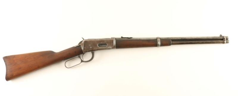 Vintage 'SRC', circa 1904. Old blued refinish, 20" bbl, full length tube magazine, two barrel bands, blade front sight, folding two leaf rear sight, replacement saddle ring, and smooth walnut stocks with metal carbine buttplate. Rifle exhibits approximately 10% of its old refinish with the balance in-the-white turning to brown patina. Good markings, solid action, fair to good bore and fair stocks with cracks, wear & chips. Condition is near good. ***C&R Firearm***