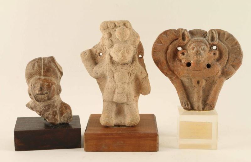 (1) Mayan Bat God Whistle Tikal, Peten Guat. 350-650 A.D. on plexiglass base. Measures 5" x 3 3/4" with base (1) Figural whistle on wood base. Unknown age or origin. Measures 5 1/2" x 3" x 3" with base. (1) Aztec terracotta human face, possibly an idol. Circa 1500 A.D. on wood base. Measures 3 3/4" x 2 3/4" x 1 3/4" with base.